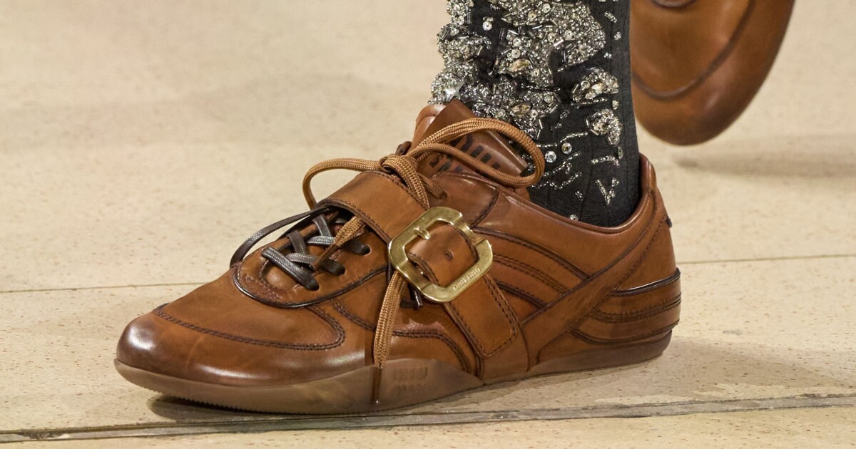Замшеві кросівки, створені у співпраці Miu Miu та New Balance, залишаються беззаперечним гітом. Міучча Прада просуває їх також у власній колекції. Там з’являється ціла низка виразних, еклектичних моделей, які дизайнерка використовує для розбавлення образів у стилі ретро. Найбажанішою моделлю сезону може стати зокрема шкіряне взуття теплого шоколадного відтінку з пряжкою.