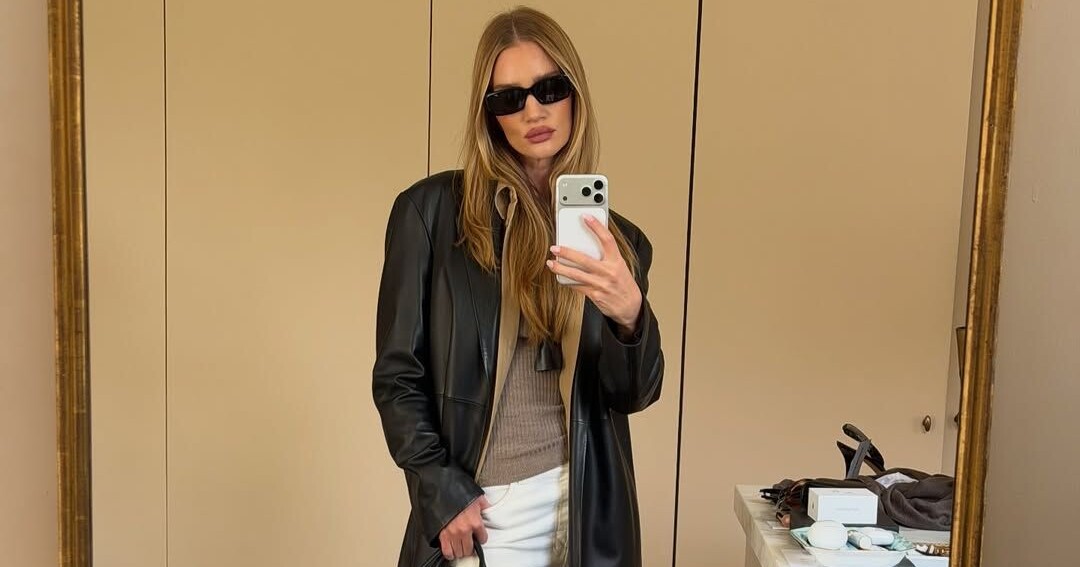 Розі Гантінгтон-Вайтлі також підтримала бежеву хвилю, обравши модель із фінішем під черепаховий панцир. Вона поєднала туфлі зі шкіряним тренчем, джемпером відтінку моко та білими джинсами. Протисонцеві окуляри та чорна сумка завершили образ, який мав одночасно простий та бездоганно вишуканий вигляд.