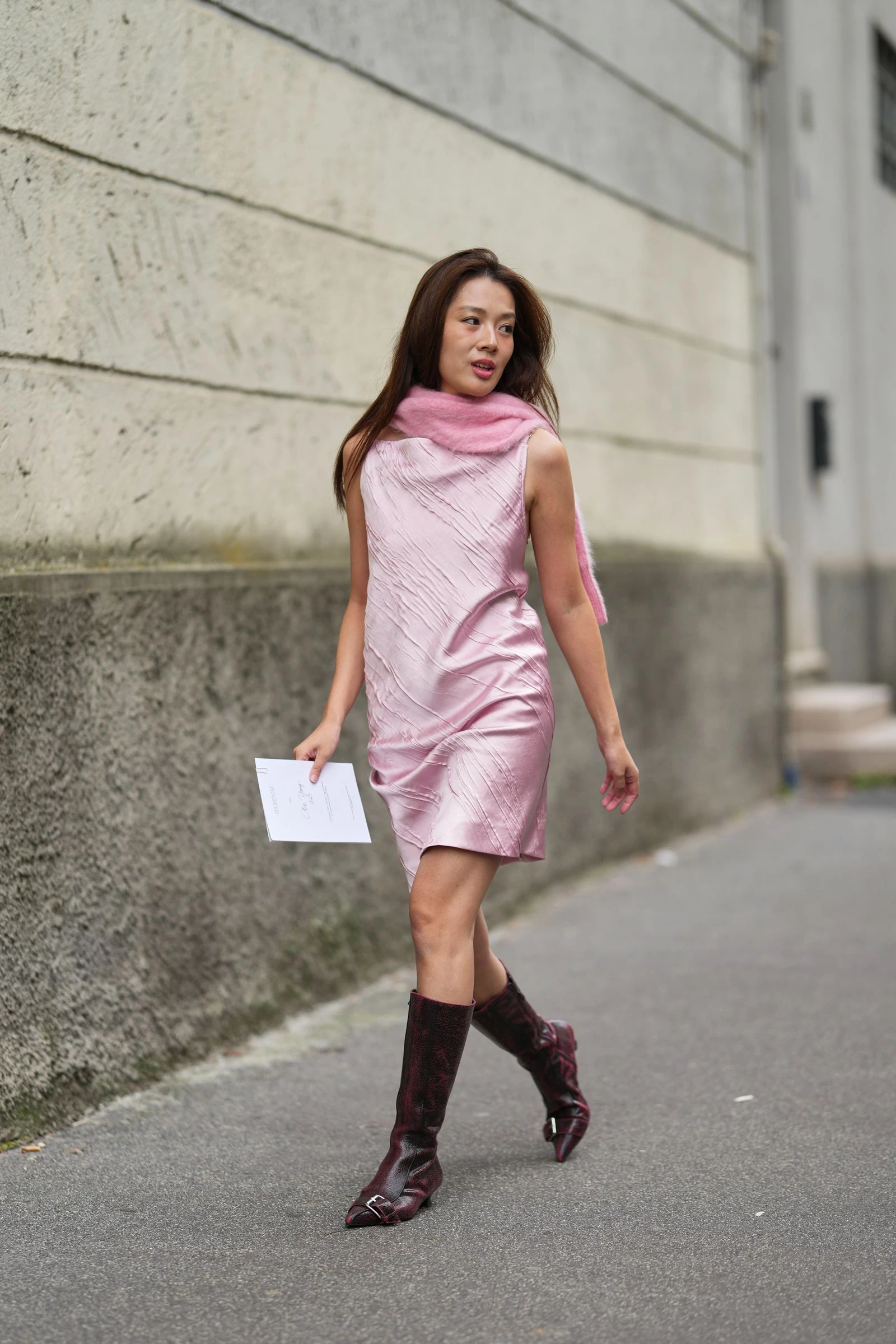 Найкращий спосіб носити бордові чоботи — створити тотал-лук у схожих відтінках. Трикотажна сукня в тон до взуття й хустка, зав’язана на талії, виглядають гармонійно та модно. Якщо хочеться контрасту, поєднуй гранатові чоботи з пастельно-рожевим — ці кольори чудово працюють разом, особливо у фактурах сатину та шкіри. Також безпрограшний варіант — темно-сірий жакет і чорні аксесуари: просто, стримано і дуже стильно.
