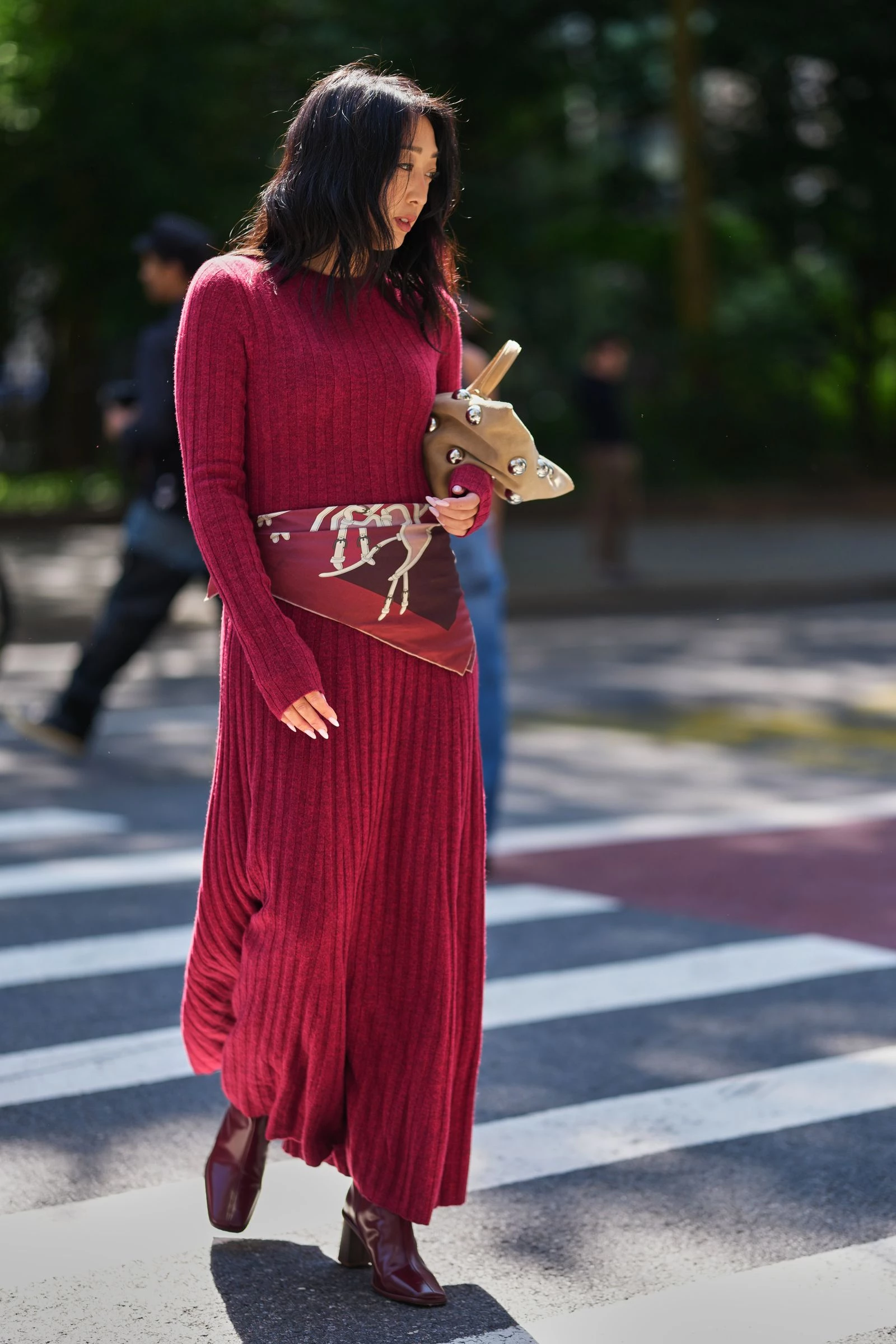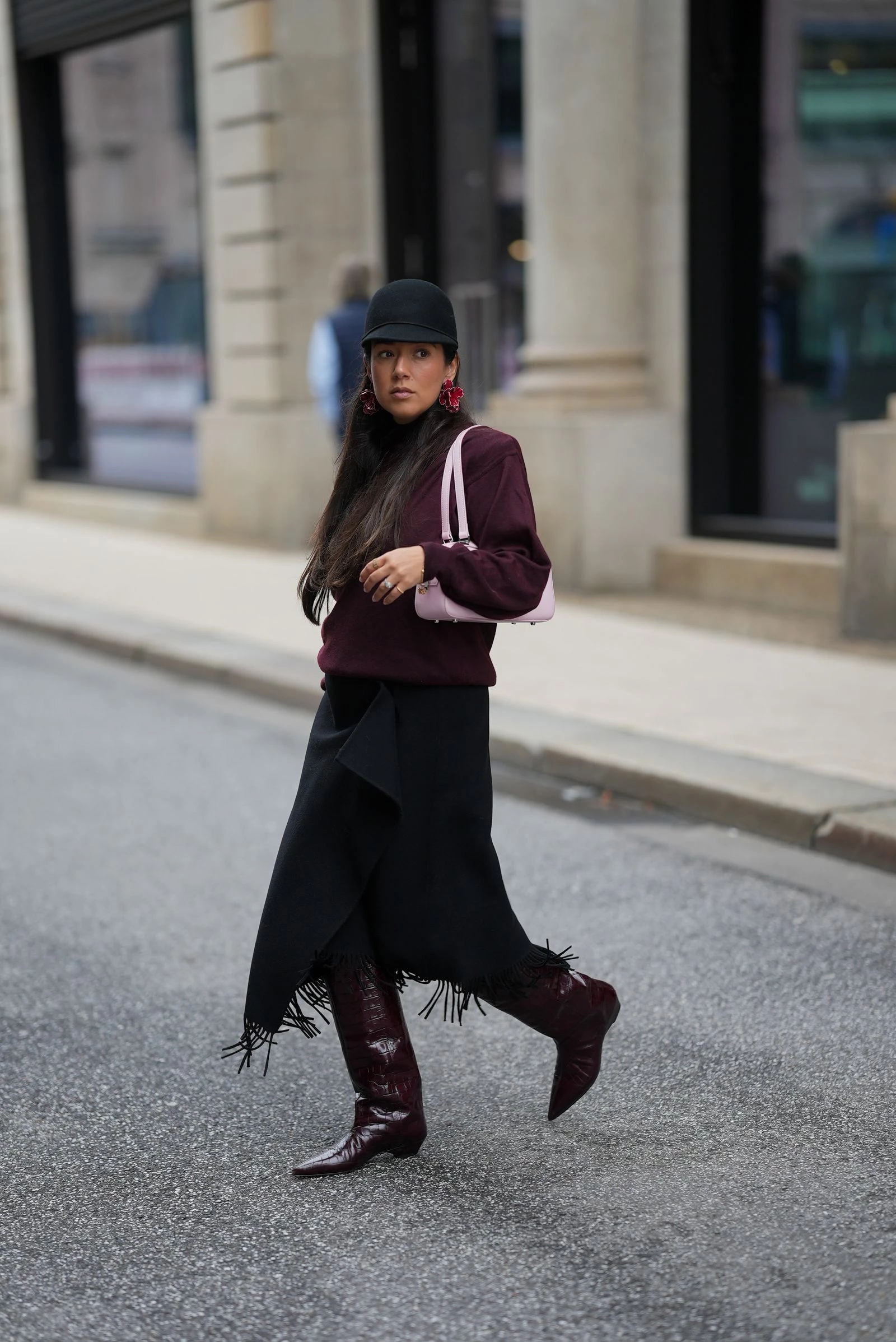 Якщо в основі образу спідниця, додай до неї елементи у схожому відтінку — топ, водолазку або бомбер у трохи темнішому гранатовому кольорі. Це створить гармонійний силует і зробить образ цілісним. Гранатові чоботи чудово поєднуються як зі спідницею-комбінацією, так і зі спідницею з бахромою. Головне — залишити взуття у фокусі, щоб воно було головним акцентом.