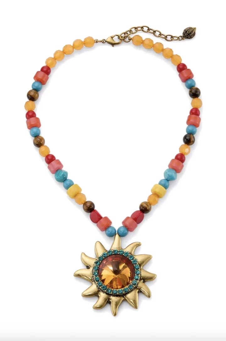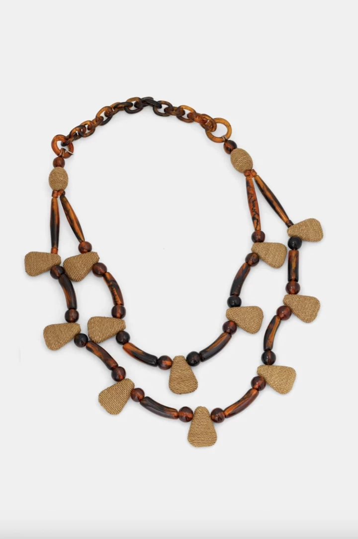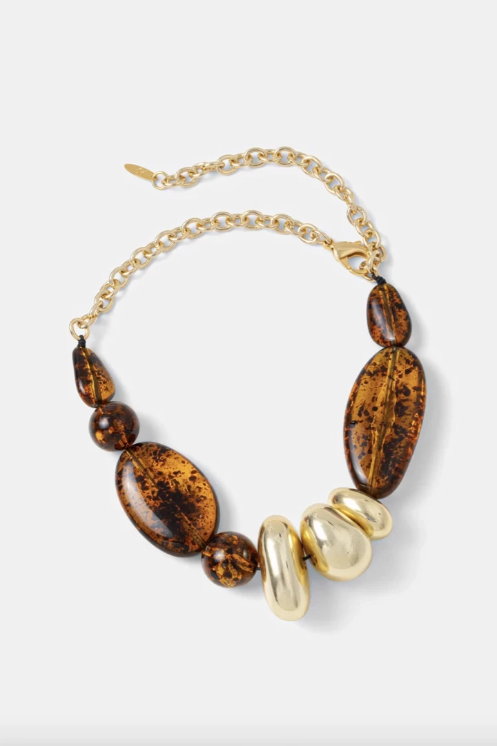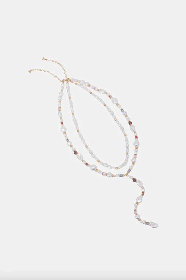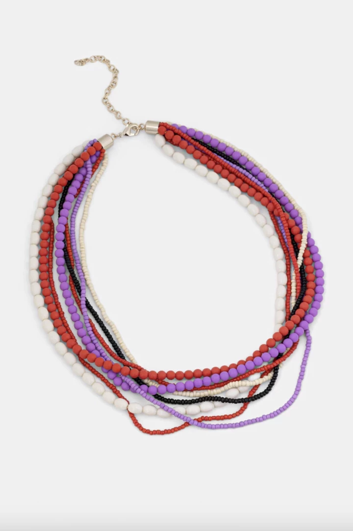 Кольорові намиста не є винятково богемними, проте в них відчувається легкість і невимушеність. Вони несуть у собі відчуття відпустки — найкраще працюють на засмаглій шкірі, поруч із купальником, ніби випадково лягаючи вздовж лінії декольте. Водночас їхній потенціал значно ширший за літні сценарії. Такі прикраси здатні оживити навіть стриманий образ: від трикотажного пуловера з V-подібним вирізом до ледь розстебнутої сорочки. До того ж бісерні намиста органічно вписуються і в міський гардероб — як акцент, що додає характеру базовим офісним комплектам.