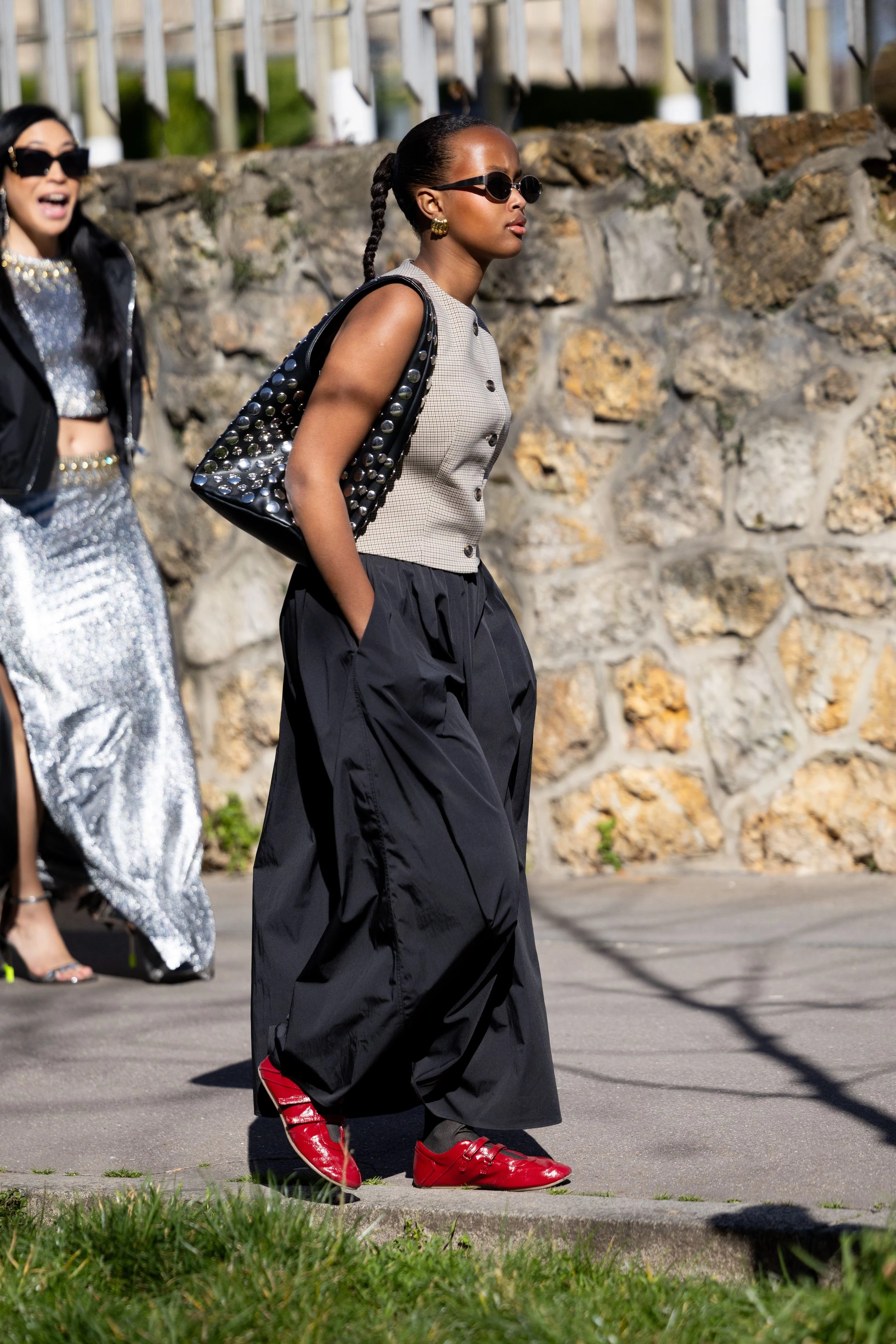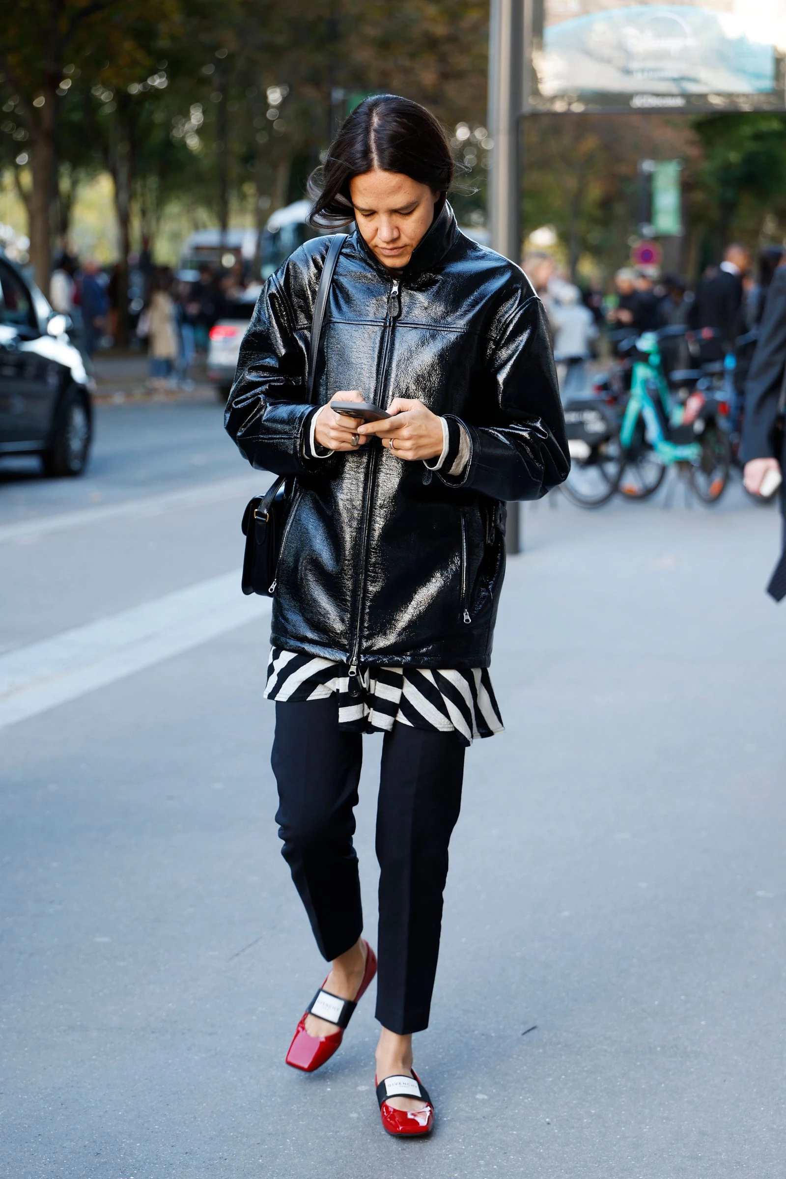 Ще один тренд сезону – червоні балетки із квадратним носком, як у колекції Givenchy. Модниці в Парижі носили їх із шкіряними куртками та класичними чорними штанами. І, безперечно, саме взуття стало зіркою цього образу.