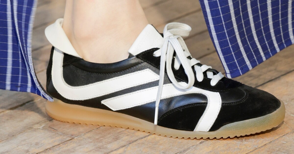 У сезоні весна-літо 2025 уся увага — на чорні кросівки. Proenza Schouler представили варіанти зі шкіри та замші, з пласкою підошвою та грайливими білими смужками. Таке ретровзуття легко поєднувати з вишуканим одягом: довгою смугастою сукнею, атласною мідіспідницею чи костюмними штанами.
