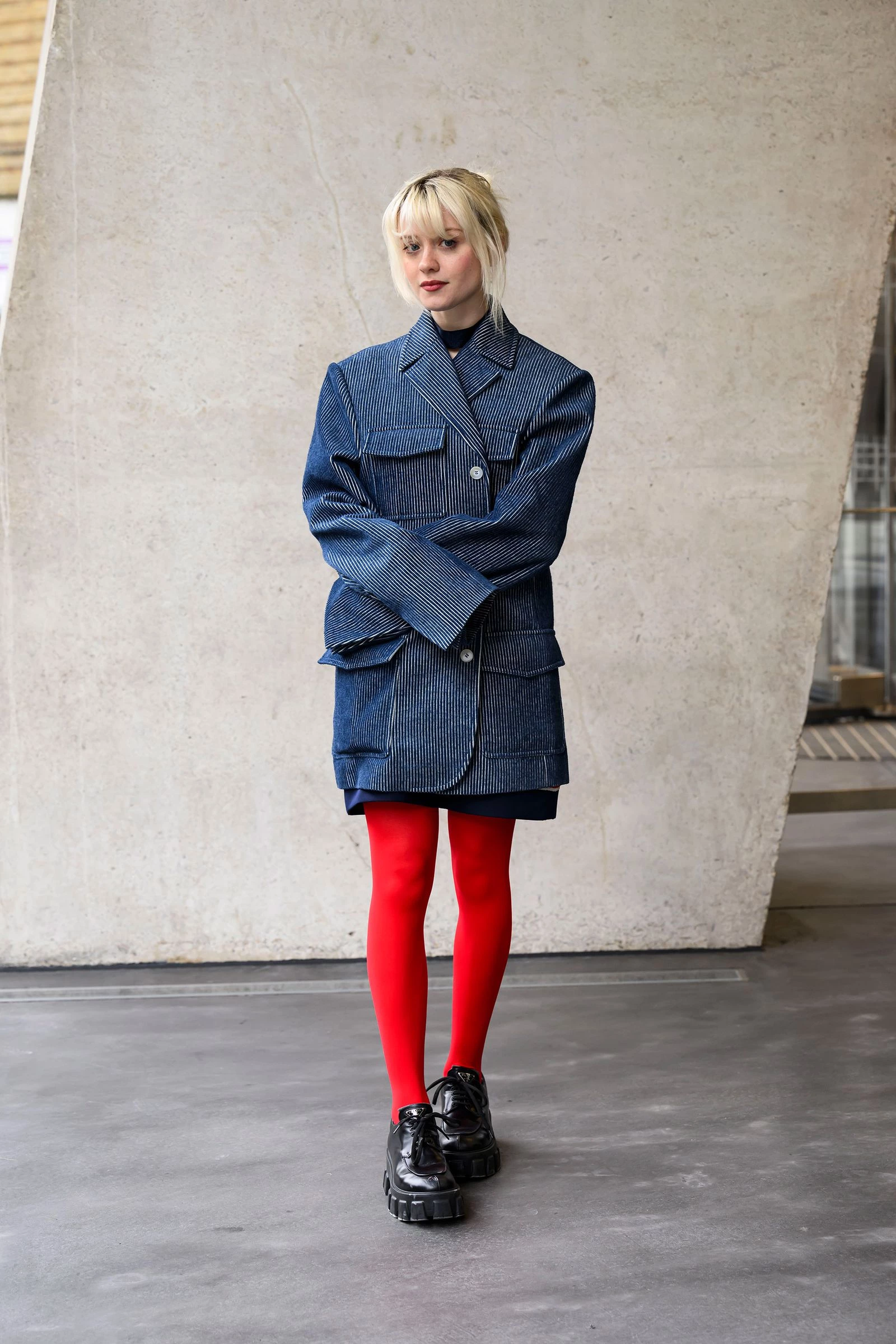 Червоні колготки вже мали свій зірковий час кілька сезонів тому, але справжні модниці знають: краще носити речі тоді, коли цього ніхто не очікує. Сміливо поєднуйте їх із лакованими дербі на платформі.
