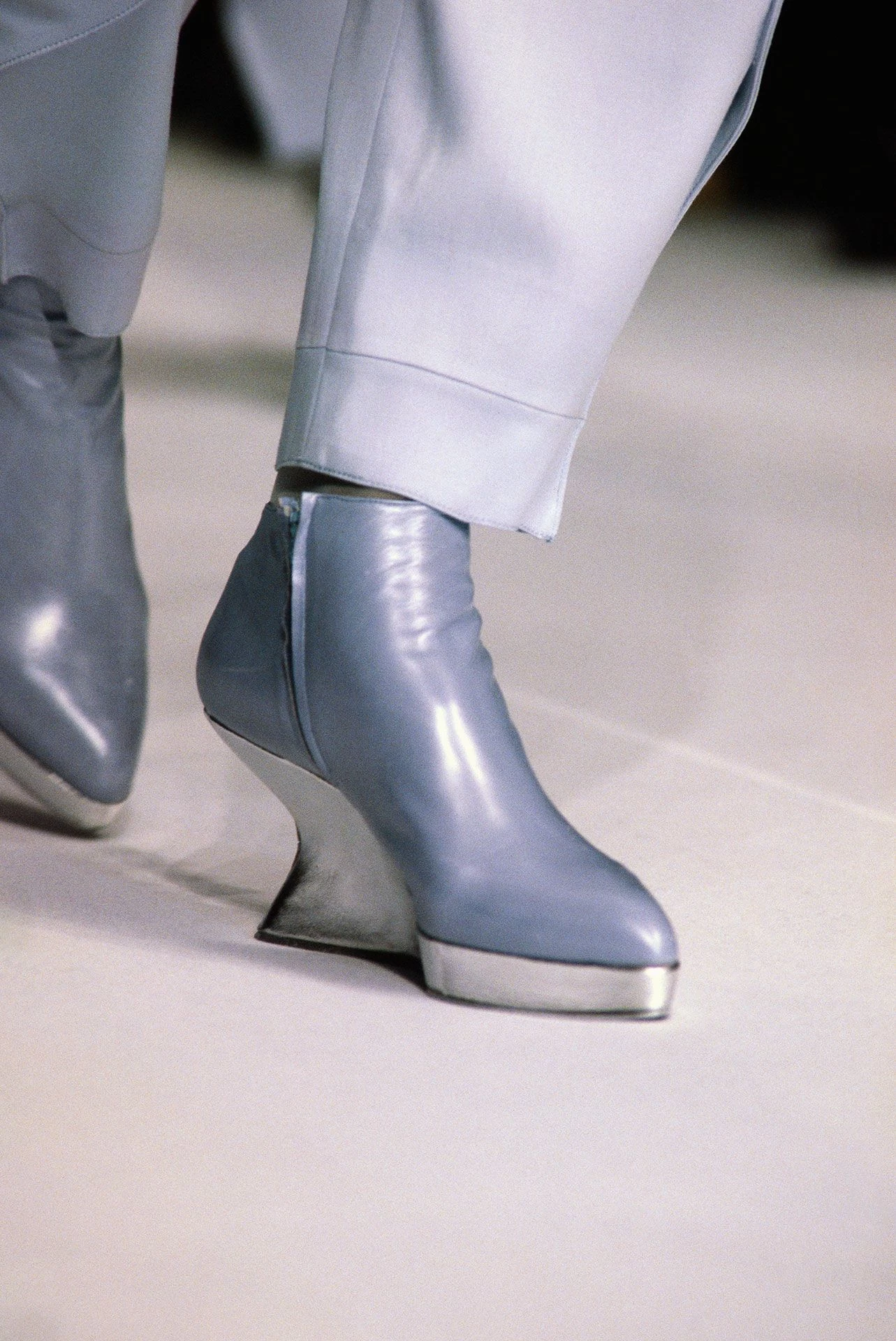 У 1984 році Тьєррі Мюглер показав чоботи на платформі з увігнутим підбором, які отримали назву "козячі копита". Це взуття виглядало незвично та зухвало. Форма підбора ламала звичні уявлення про конструкцію черевиків на підборах. Для середини 1980-х таке рішення було радикальним. Ці ботильйони стали одним із перших прикладів скульптурного підходу до дизайну взуття на підборах. Мюглер продемонстрував, що підбор може бути не лише опорою, а й головним елементом форми. Після цього показу експерименти з нестандартними підборами почали активно з’являтися в колекціях інших брендів.