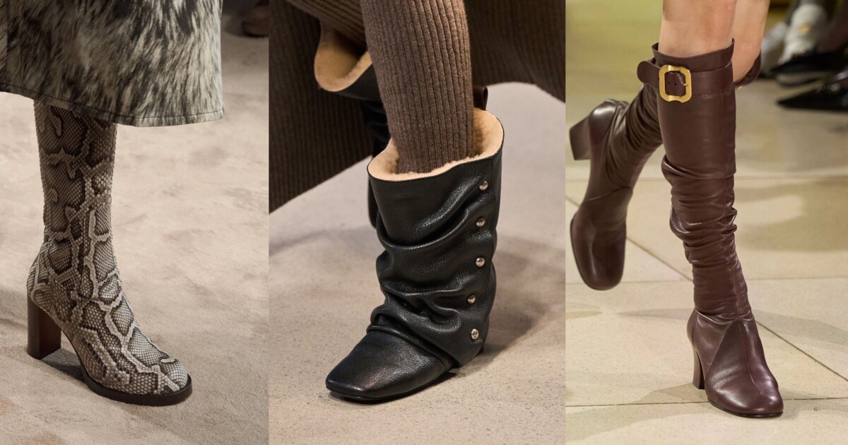 Slouchy boots, слідом за трендовими сумками, стали головним взуттєвим трендом сезону осінь-зима 2025/2026 і були помічені у багатьох колекціях. Ralph Lauren і Zimmermann представили більш стримані варіанти – чоботи до колін з піратськими деталями та м’якими складками шкіри, а Balmain, Isabel Marant та Louis Vuitton показали більш виразні силуети, що нагадують чоботи з 2000-х.