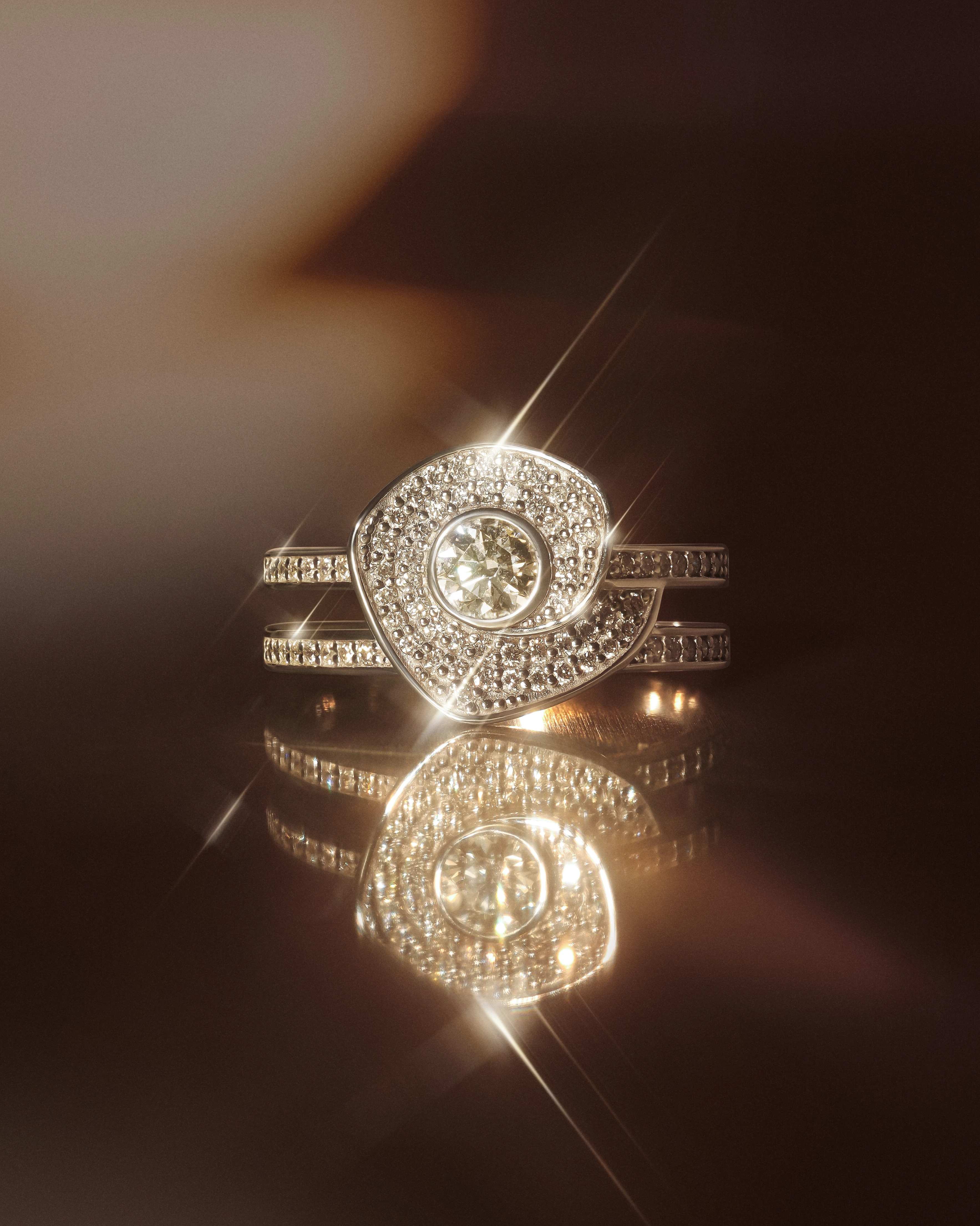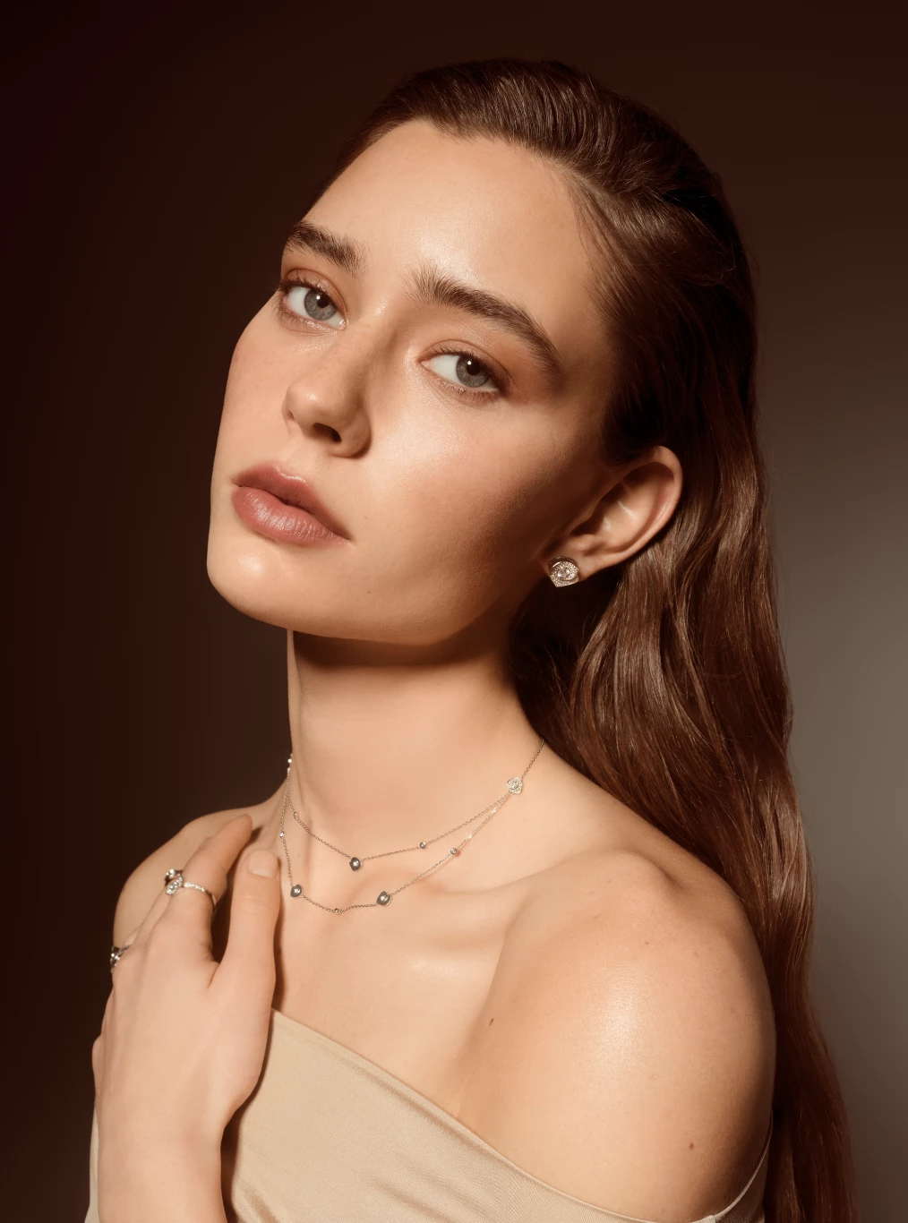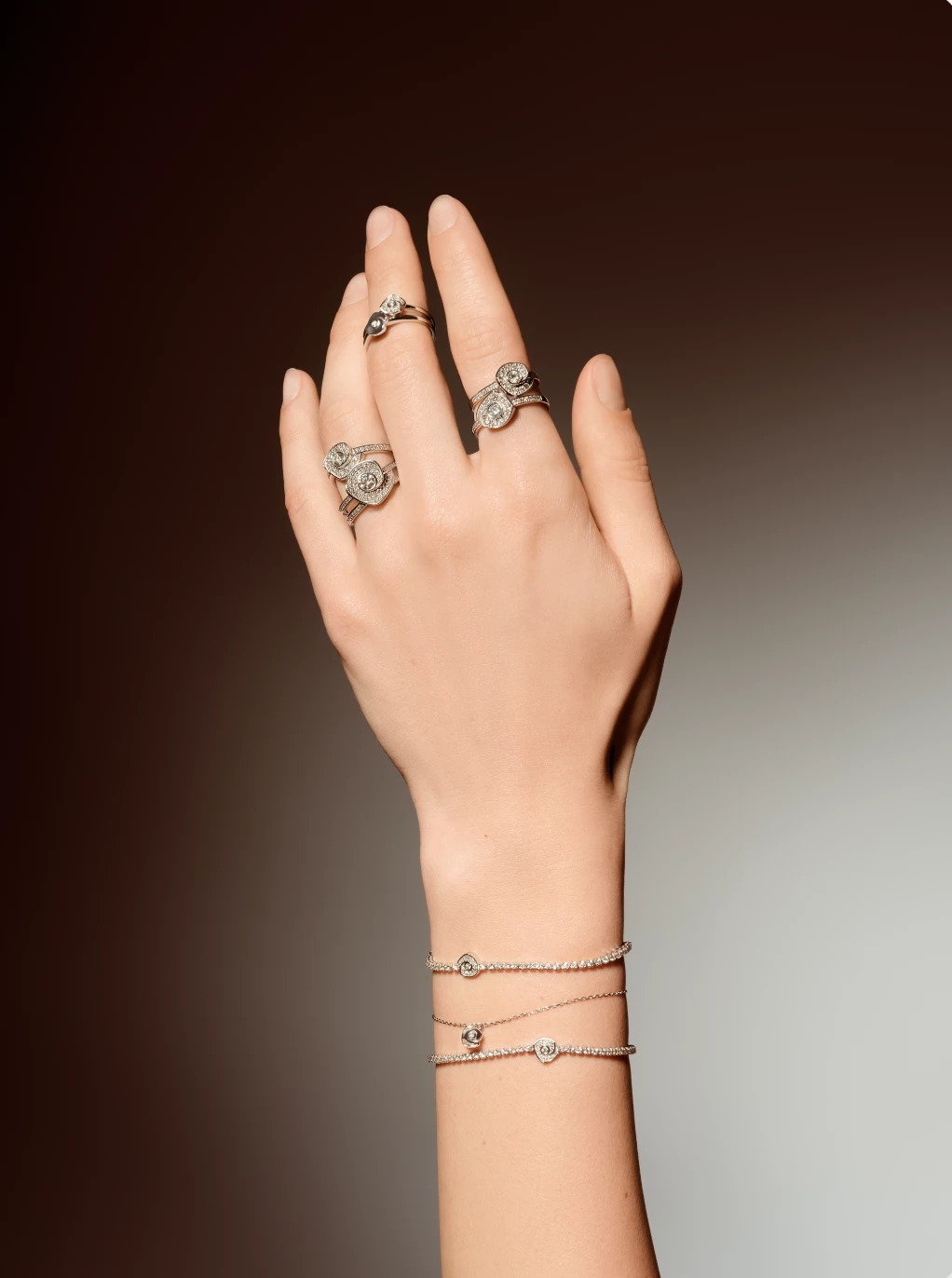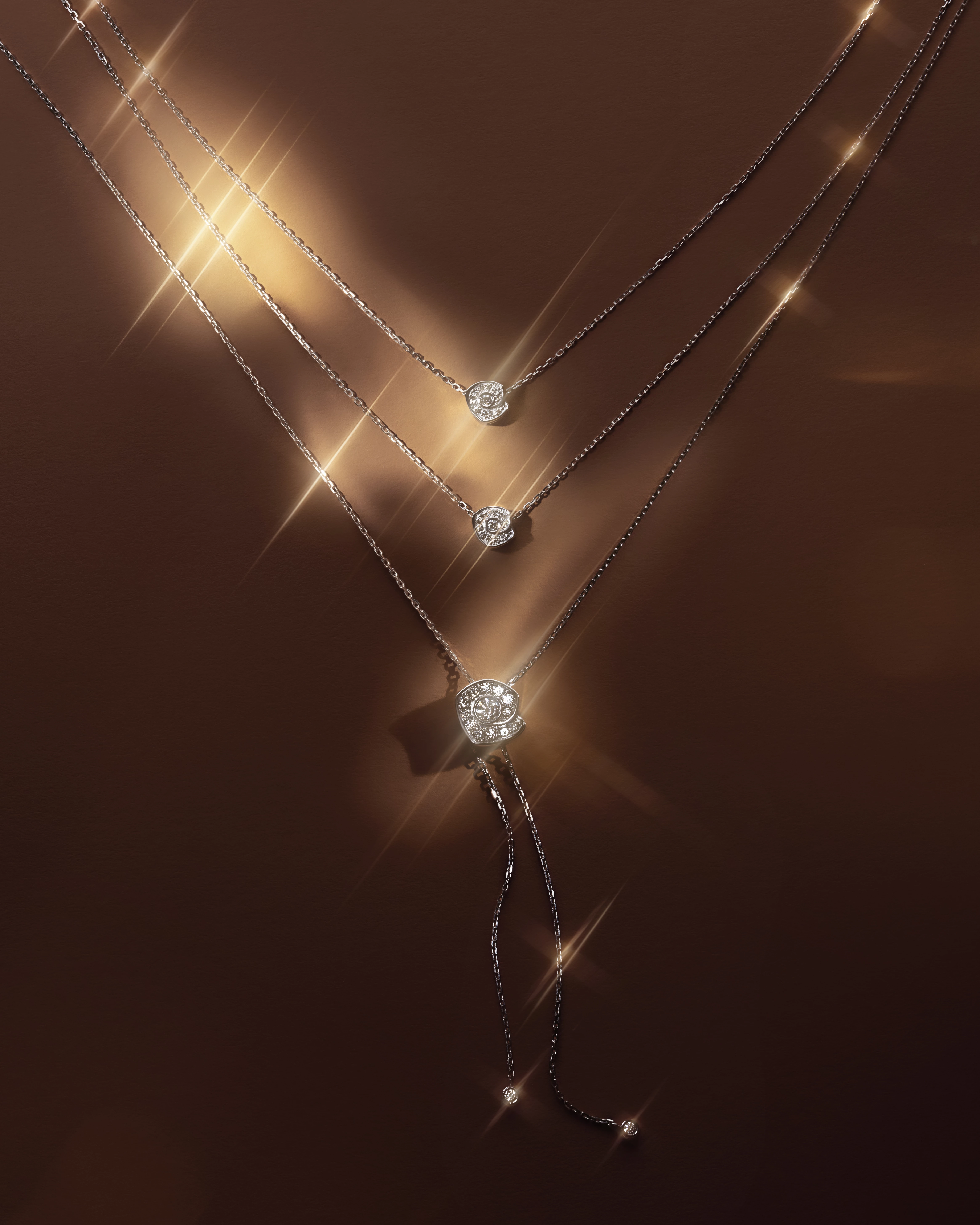 У колекції – дві інтерпретації троянди: лаконічна, з гладкими тендітними пелюстками, та розкішна – повністю всипана діамантами різних розмірів. Разом вони створюють об’ємне світіння, що ніби світло проходить крізь пелюстки. Прикраси можна нашаровувати та поєднувати – ідеальне рішення для делікатного акценту вдень, який легко доповнити для виразного святкового комплекту на вечір.