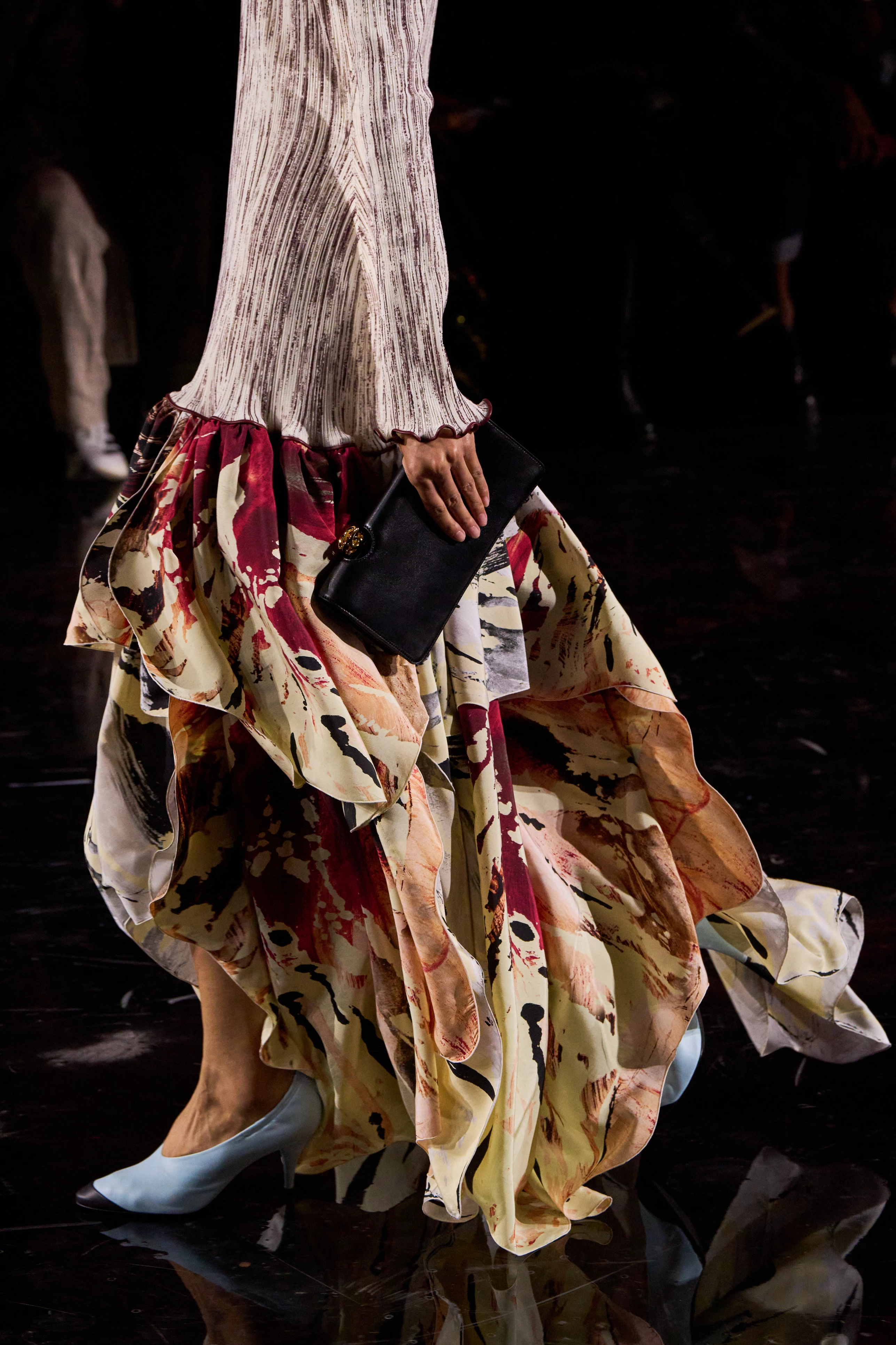 Цю ж дуальність продовжували мюлі, що поєднували матову шкіру з лакованими мисом. Босоніжки з контрастом чорного і білого мали ретрофутуристичний характер, перегукуючись із космічним антуражем шоу, а бордові дербі на пласкій підошві закликали до безтурботної прогулянки.