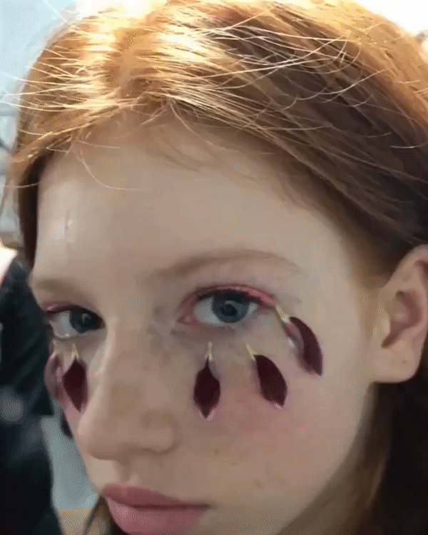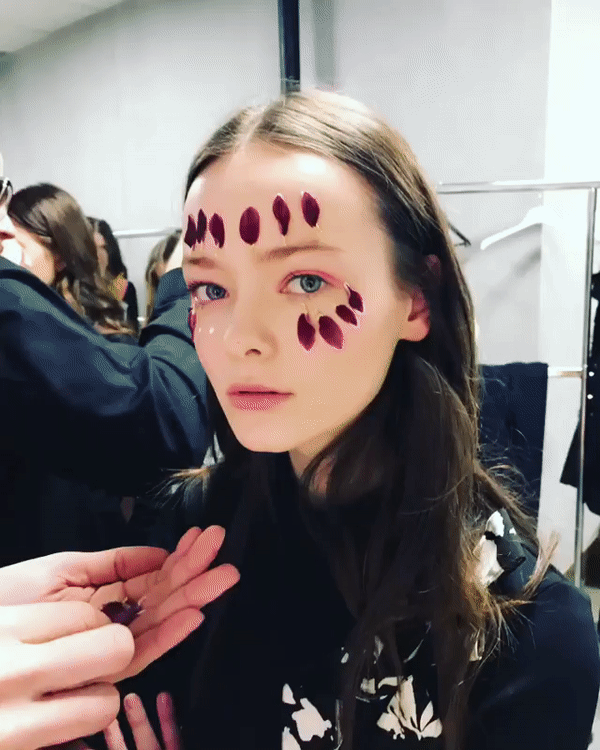 Лепестки цветов на лицах моделей в сочетании с сочными розовыми тенями на верхних веках можно отметить как один из самых красивых бьюти-образов сезона MBKFD. Идея такого макияжа пришла к дизайнеру спонтанно. Vogue.ua Анна Каренина рассказывает о том, как это было: "В ноябре прошлого года у меня была очень спонтанная съемка с Сашей Самсоновой. Было холодно, мы снимали в студии, и у нас не было дополнительного оборудования и остальных необходимых вещей. Был только креативный поток двух людей. Мы решили взять вазелин, цветы и обклеить ими лицо. В итоге получилась одна из самых лучших съемок бренда Anna K. Мы настолько влюбились в эту идею и этот образ, что решили использовать его и для показа".