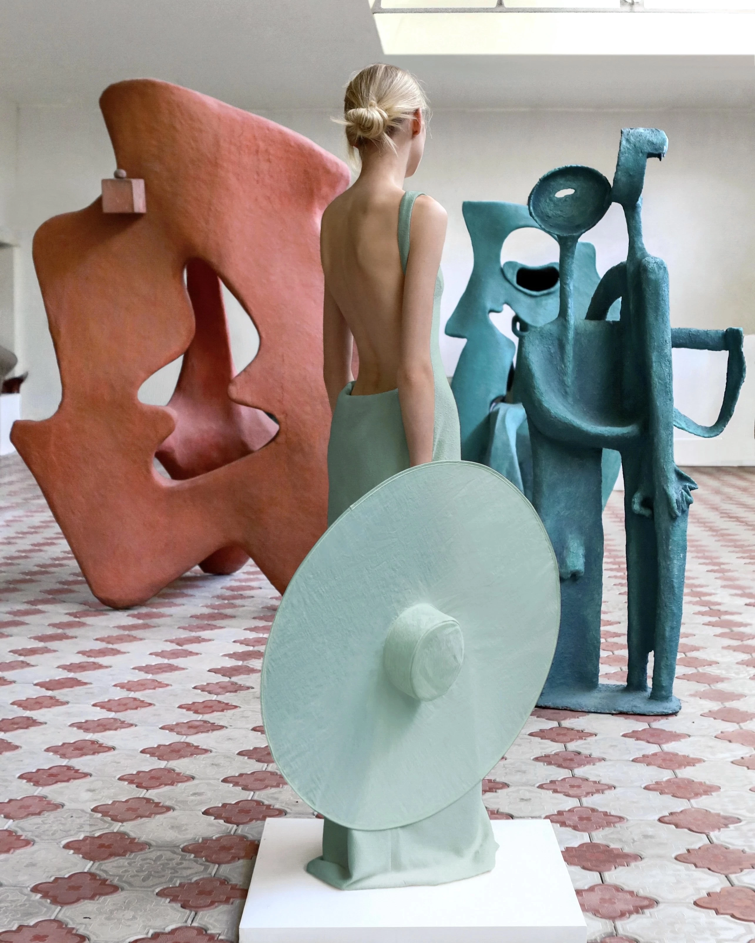 Також завдяки бренду ми дізналися більше про скульптора Михайла Дзидру. Влітку 2024-го Ruslan Baginskiy представили проєкт, який став ніби діалогом між дизайнером та митцем. "Я завжди цікавився скульптурою та розглядав головні убори як скульптурні об'єкти, — коментує Руслан Багінський. — Усі головні убори, що фігурують у проєкті, — мій діалог з палітрою та формами Михайла Дзиндри. Я був вражений його творами та великим внеском в українське мистецтво, мені давно хотілося поділитися цією історією в такій формі."