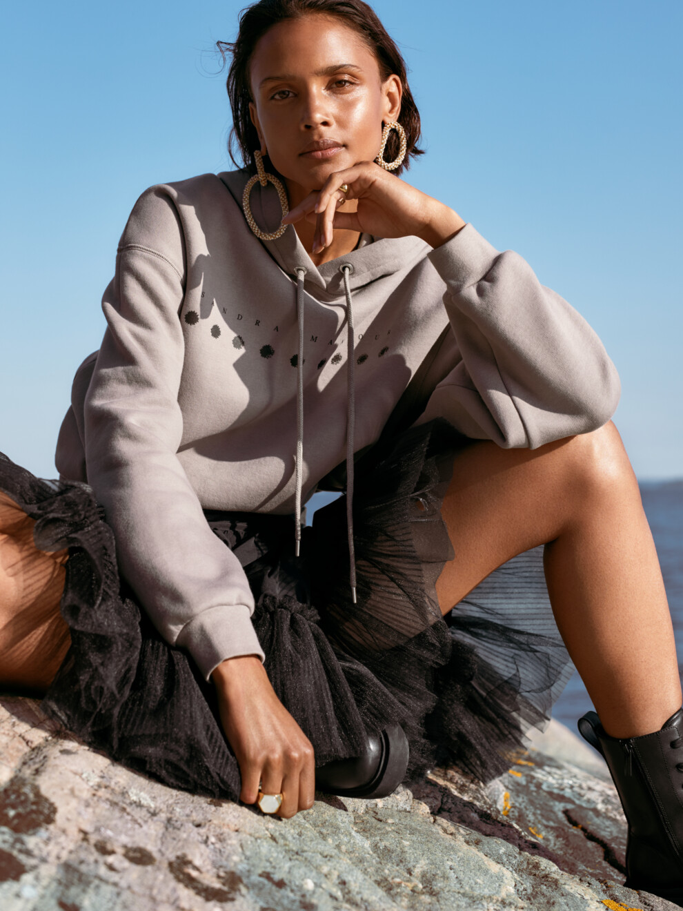 H&M x Sandra MonsourСандра Мансур заснувала свій модний дім у 2010 році. Її увага до деталей і особлива майстерність, поєднана з натхненням від мистецтва та її оточення в Бейруті, відображуються в кожному виробі. Для колекції Sandra Mansour x H&M Сандра брала натхнення з елементів природи й робіт художниць — Тоєн, Доротеї Таннінг і Бібі Зогбе. Результат — жіночний асортимент суконь, блузок і спідниць, строгий піджак, а також футболка й толстовка c логотипами. Розкльошені форми й шлярки по краях поєднуються з виразними деталями в природній колірній палітрі сірого, чорного, а також кольору слонової кістки.