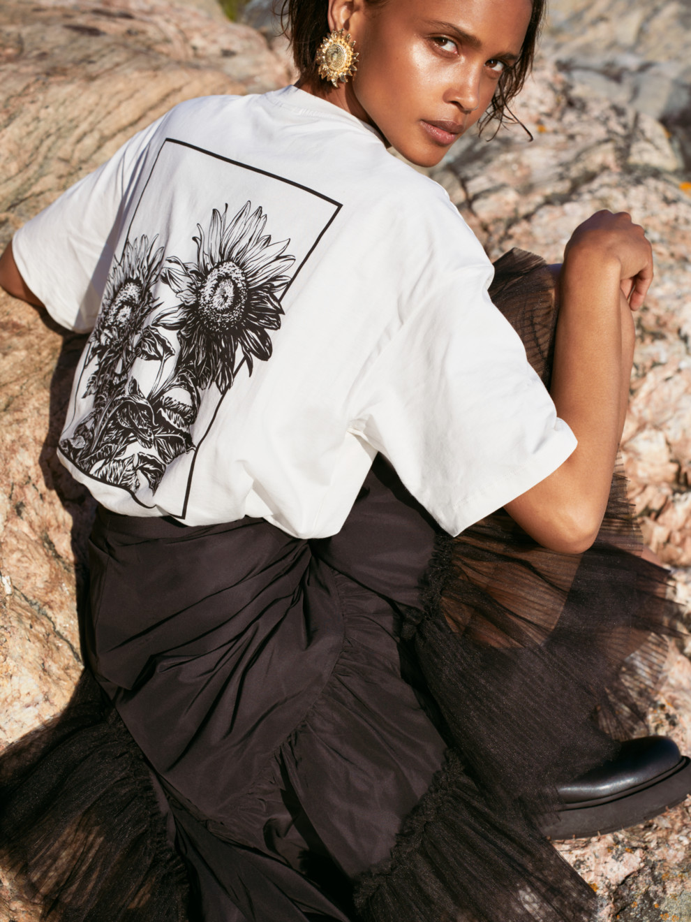 H&M x Sandra MonsourНазивається ця колаборація Fleur du Soleil, що в перекладі з французької означає "Соняшник". Дизайнерка була зачарована тим, як соняшник повертається до сонця. Силуети соняшників прикрашають чисті, ніжні тканини й підкреслюють майстерність авторки.
