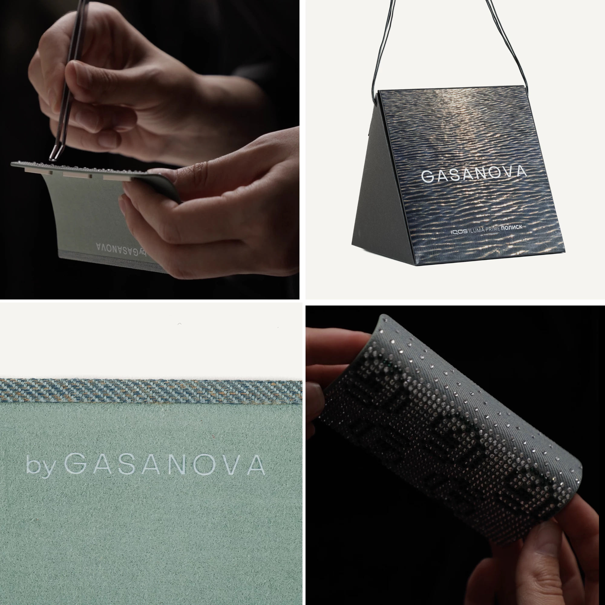 Однією з характерних технік бренду стало використання кристалів. У колекції IQOS Atelier GASANOVA створив накладку, вручну оздоблену щільним розсипом преміальних кристалів з високим рівнем заломлення світла. Поверхня переливається при кожному русі, нагадуючи текстуру коштовного каменя — і стає не лише декоративним елементом, а способом виділити предмет у просторі, надати йому сценографічної сили.