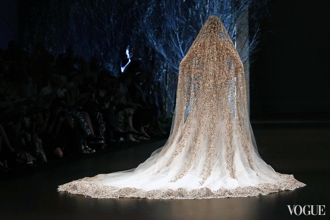 Свадебное платье Ralph & Russo Couture сочетает в себе роскошь и сдержанность – качества, которые высоко ценят клиентки кутюрных брендов из восточных и азиатских стран. Дизайнеры марки Тамара Ральф и Майкл Руссо в этот раз отдали предпочтение крою, подчеркивающему фигуру, но максимально закрывающем тело. Даже вместо популярных сегодня бюстье или V-образного выреза платье украшал высокий воротник в духе викторианской эпохи. Однако ручная вышивка драгоценными нитями, бусинами и золотистым бисером полностью компенсировала первоначальную скромность наряда.