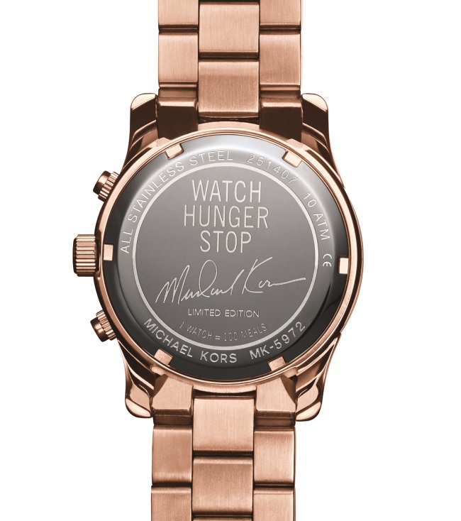 Специально для проекта бренд выпускает лимитированную серию часов: продажа одного экземпляра помогает предоставить питание сотне детей. По данным на июль 2014 года дом Michael Kors уже обеспечил едой более 5 миллионов детей. В этом году коллекцию часов Watch Hunger Stop пополнит еще одна модель унисекс. За основу новой версии часов взят дизайн самой успешной коммерческой модели Runway. Это часы оттенка розового золота с серо-голубым циферблатом, на который нанесена подробная карта мира, а на внутренней стороне циферблата выгравировано название кампании "WATCH HUNGER STOP", а также надписи "1 пара часов = 100 накормленных детей".