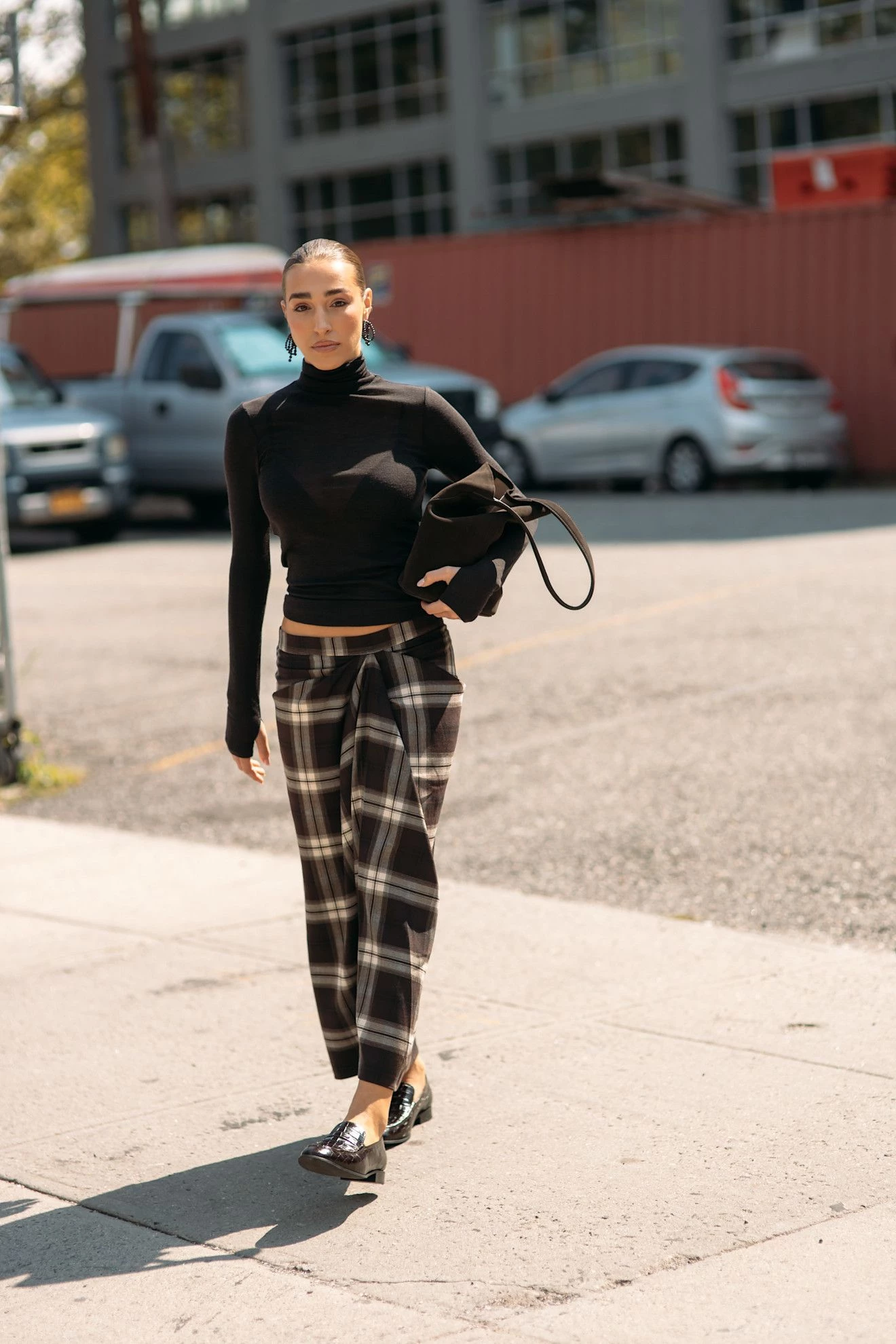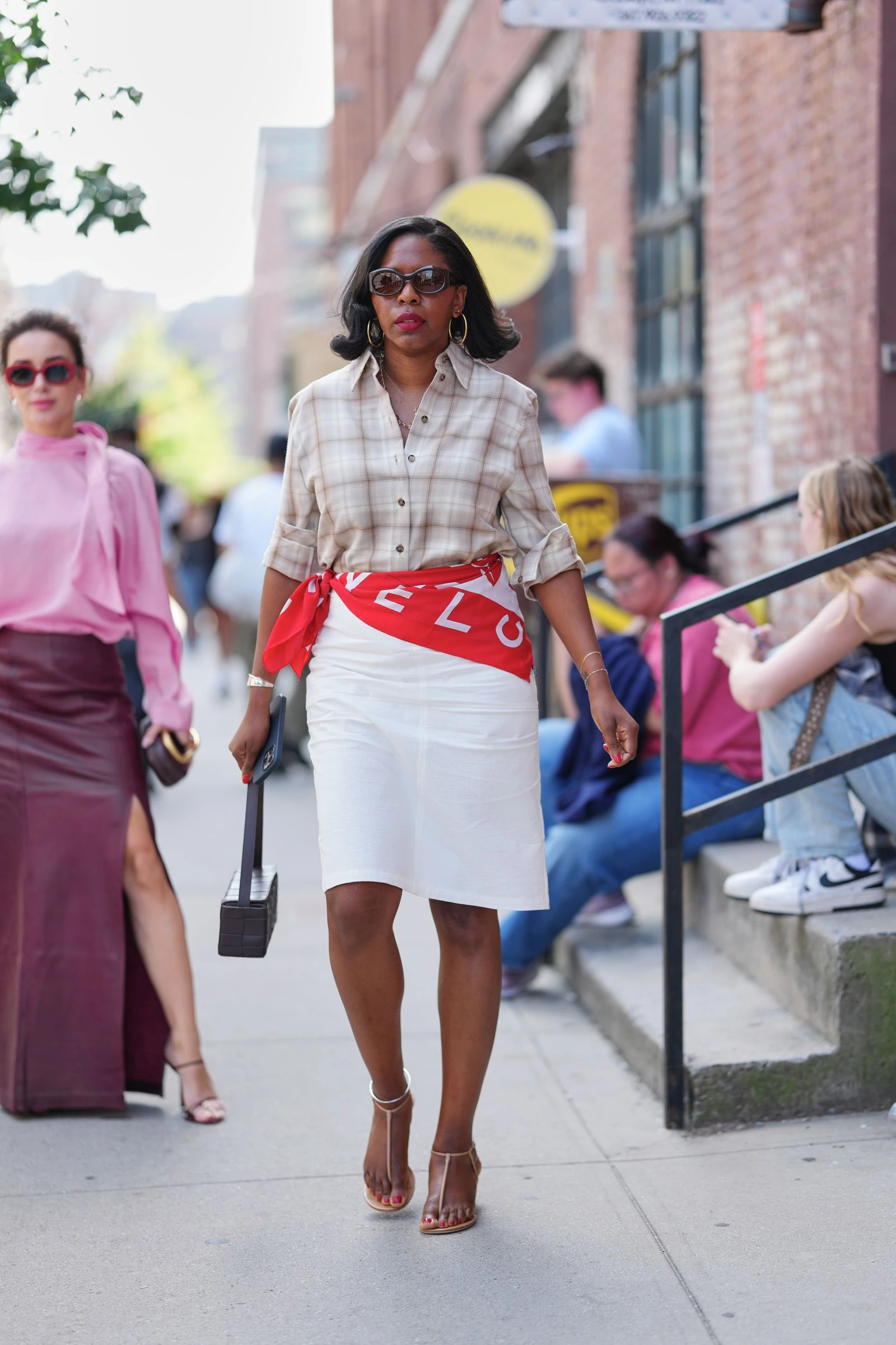 У стрітстайл-параді особливо вирізнялися речі в клітинку: згадану сорочку у бежевому та яскраво-блакитному відтінках бачили знову й знову. Її носили застібнутою й заправленою у спідницю-олівець, розстібнутою поверх костюма та зав’язаною на талії — швидкий стилістичний прийом, який протягом останніх тижнів траплявся постійно. Окремої згадки варта й картата драпірована спідниця довжини міді за €129. Стрітстайл-улюблениця Таму Макферсон подвоїла клітинку, поєднавши цю коричневу спідницю з яскраво-блакитною сорочкою на ґудзиках.