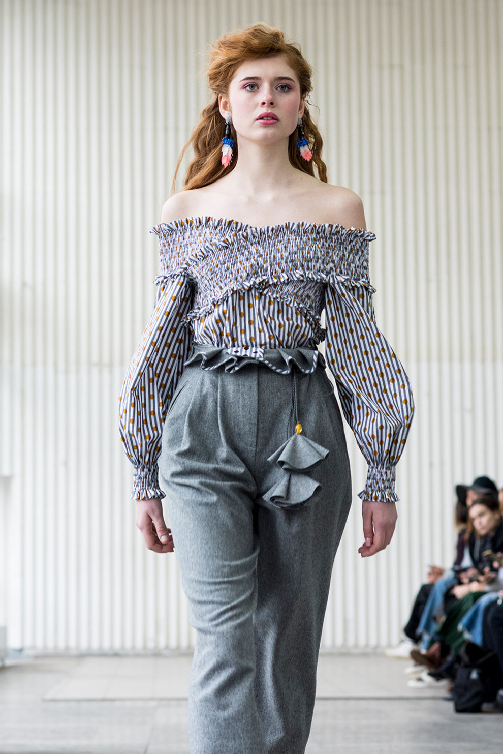 Показ осенне-зимней коллекции Litkovskaya прошел в спортивном зале, а сама она была построена на противопоставлении религии и спорта. Сложноскроенные вещи соседствовали на подиуме с романтичными платьями и спортивными сумками. Многие из них были украшены лаконичными брошами, сделал который молодой украинский ювелирный бренд Guzema Jewellery.
