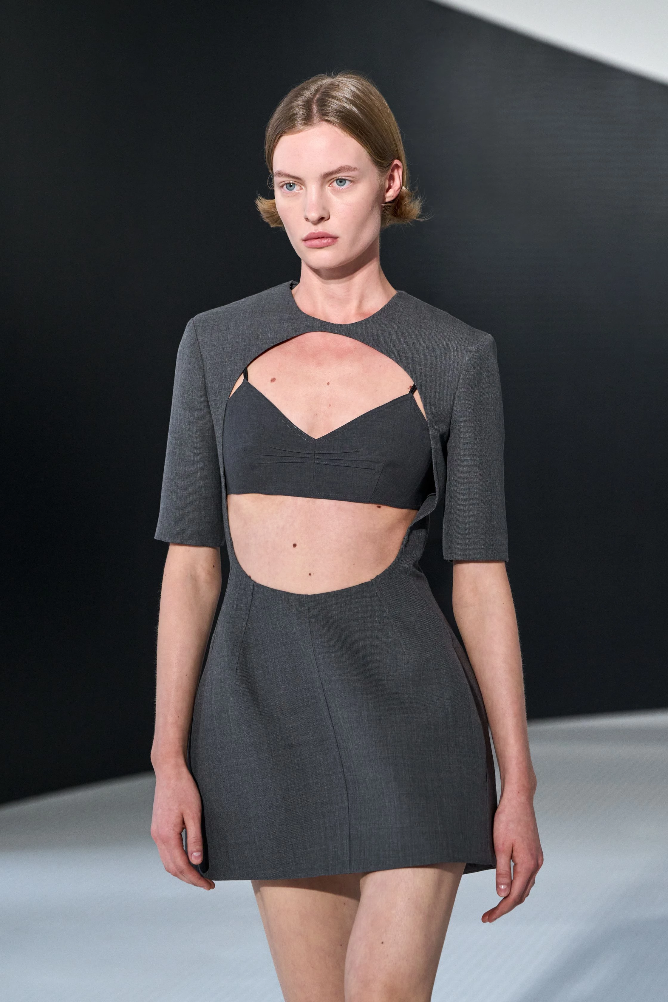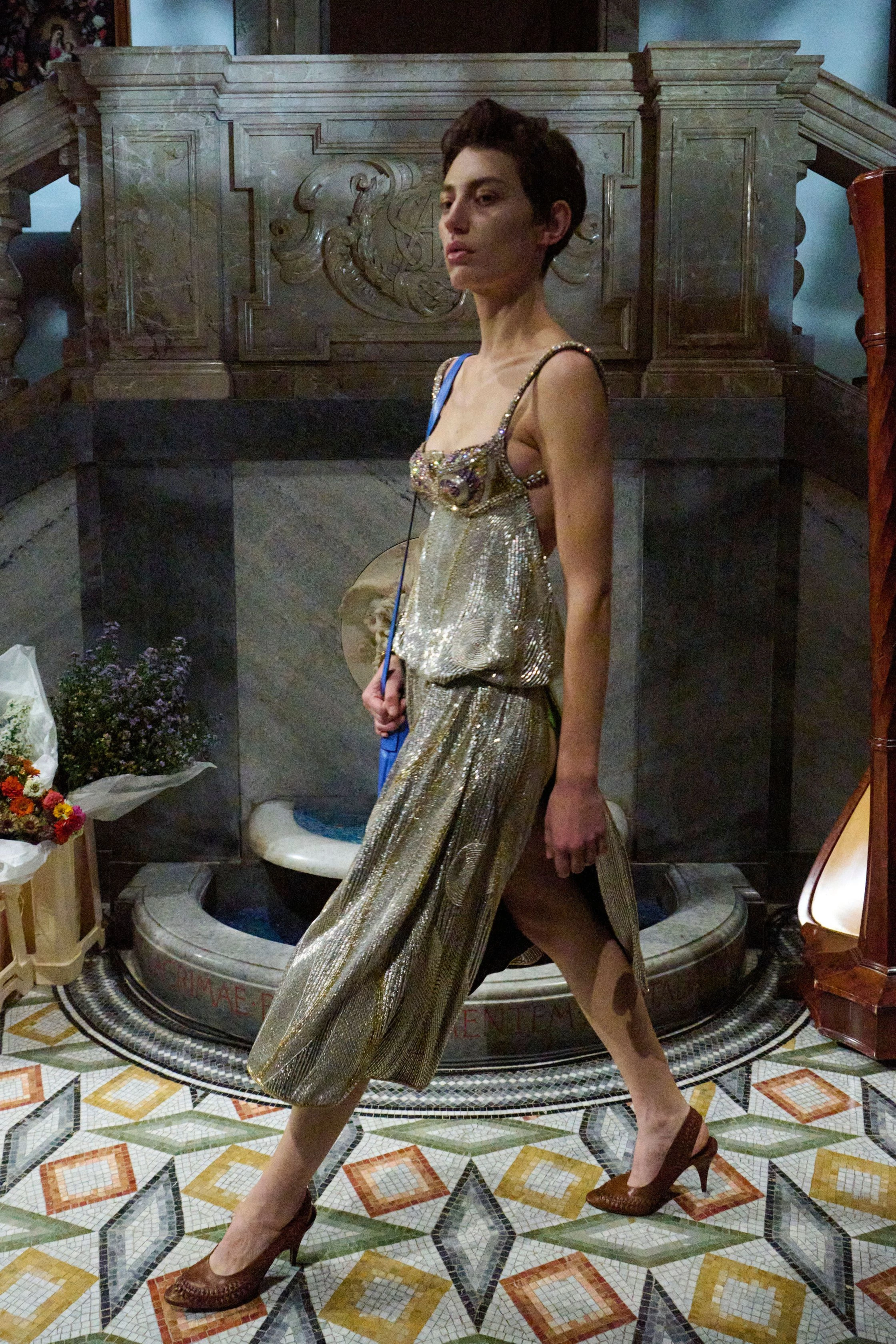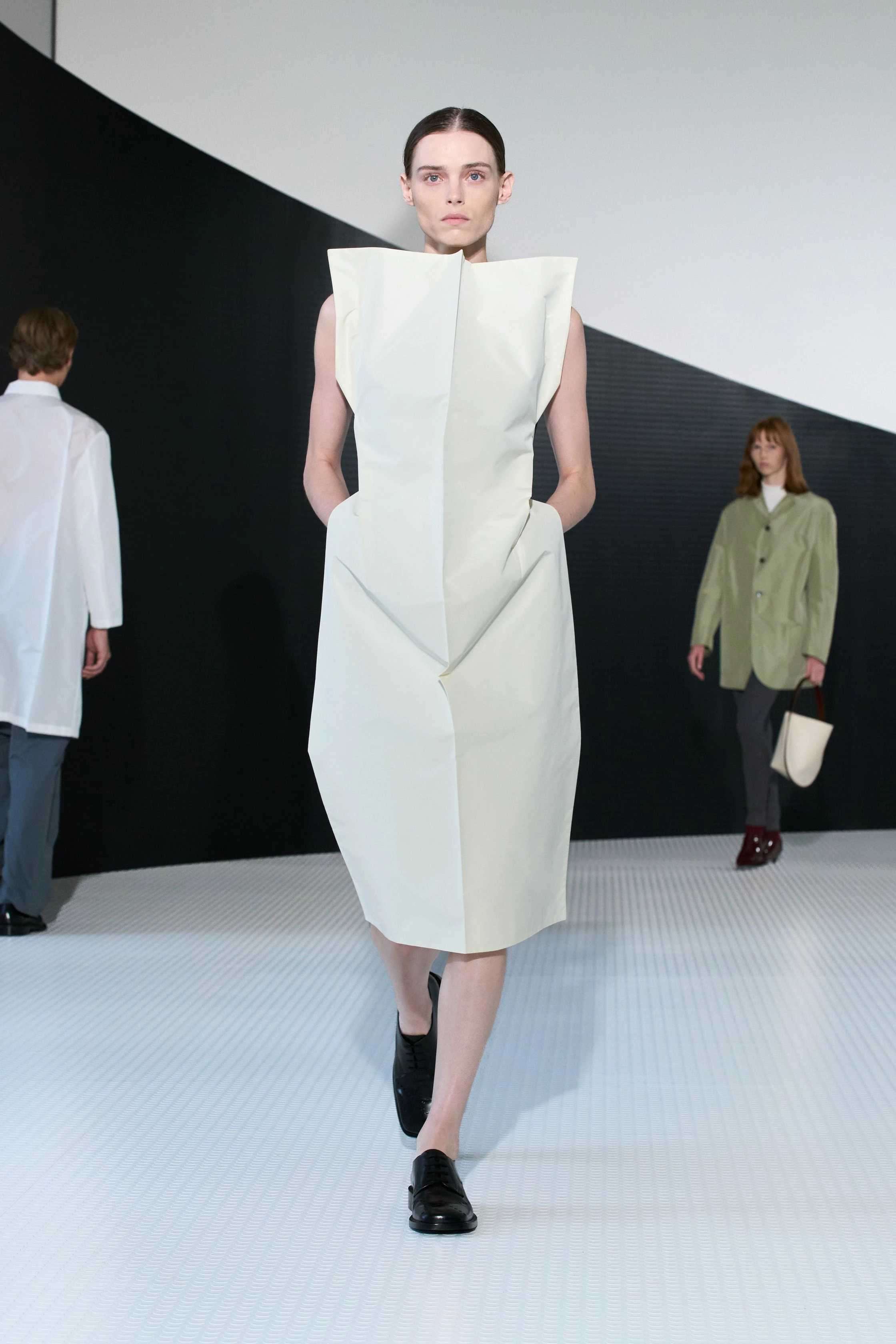 Масивні силуети з акцентованими плечима поєднувалися з легкими шовковими сукнями, які мали зовсім невагомий вигляд. В аксесуарах Троттер звернулася до архівів бренду, представивши нову версію клатча Lauren Hutton із фільму "Американський жиголо". Дебют Луїз Троттер у Bottega Veneta показав, що дизайнерка впевнено володіє мовою бренду й здатна розвивати його спадщину й водночас звучати переконливо сучасно.