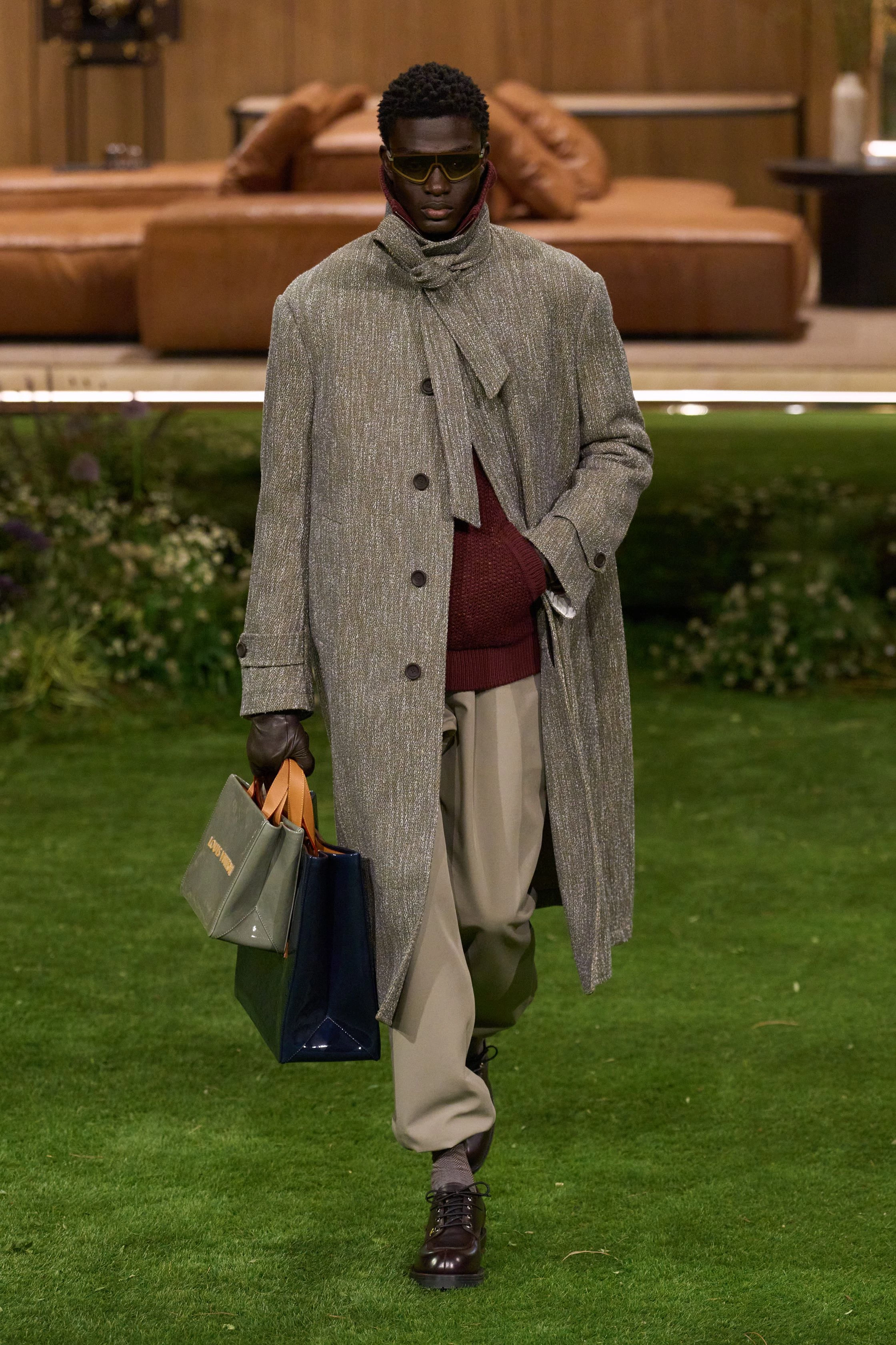 У центрі колекції – прагматична технічність, накладена на класичний чоловічий гардероб. Але без відмови від матеріальної розкоші: норковий бомбер, пальта з жакарду, вовни, альпаки й нейлону, вручну вишиті кристалами у формі дощу. Фотопринти на куртках і пальтах відтворюють пейзаж, побачений крізь вікно, залите дощем – особистий спогад Вільямса з дитинства у Вірджинія-Біч.