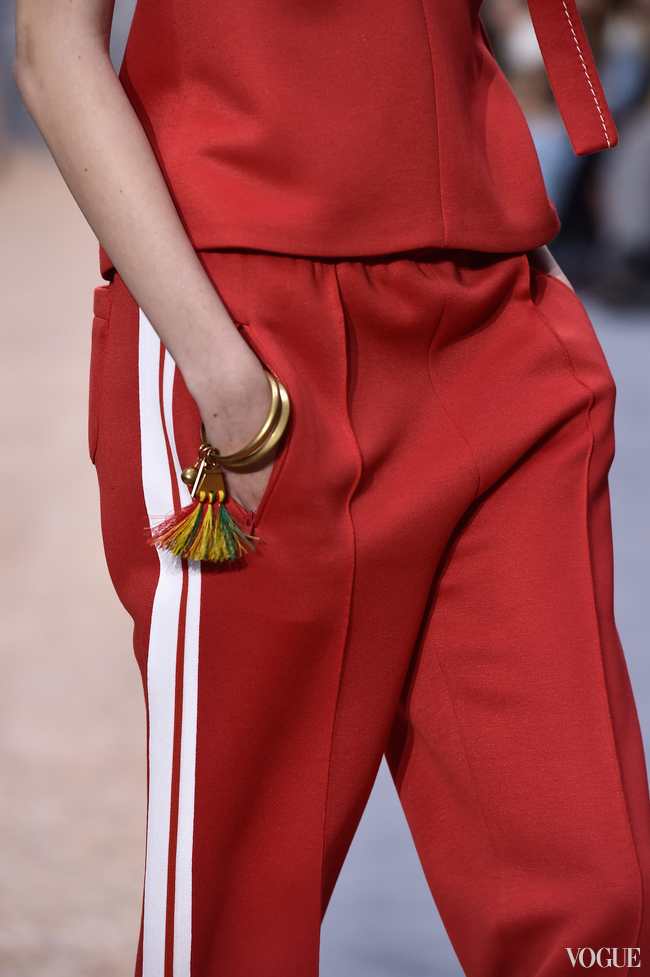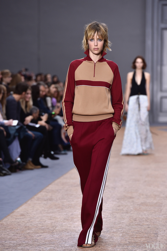 В его новой коллекции по-прежнему остались оборки, струящиеся ткани и деликатное кружево, но соседствуют они теперь со спортивными костюмами бордового оттенка с тремя вертикальными полосками. Еще недавно такие можно было увидеть в коллекциях исключительно спортивных марок, а сегодня они открывают показ Chloe.