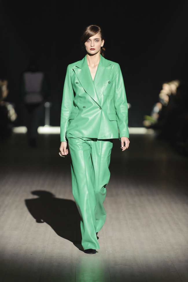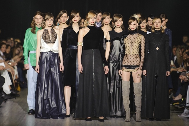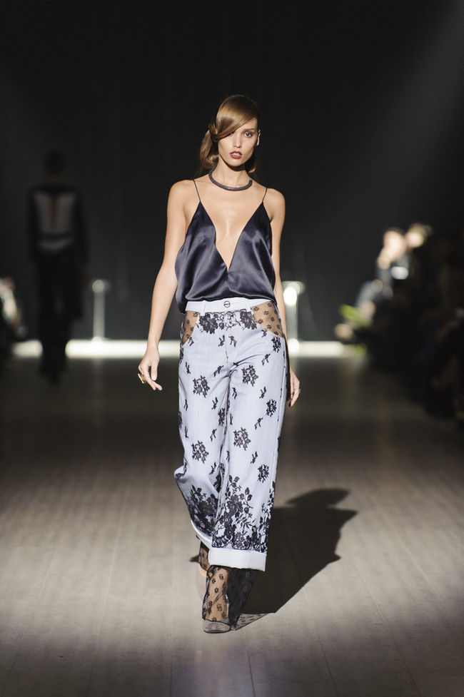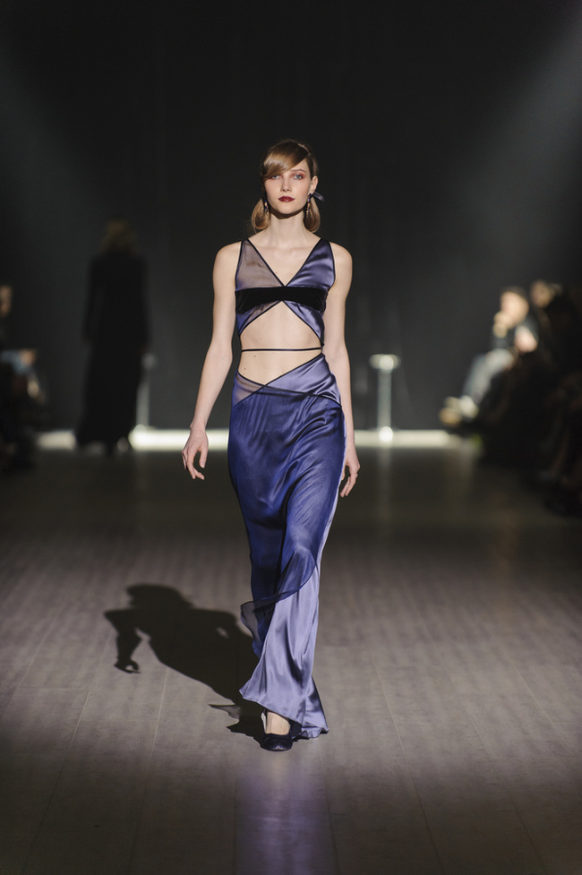 Сквозь занавес из тяжелого черного бархата на подиуме Frolov появлялись девушки в полупрозрачных платьях в паре с замшевыми ботфортами, имитирующими чулки под пояс, брючных костюмах из ярко-зеленой кожи, бархатных пальто с предельно высокими разрезами, джинсах расшитыми мистическими знаками, шерстяных нарядах с обозначенными бандажными деталями и вечерних туалетах с провокационными прорезями и молниями, которые в любой момент могут расстегнуться.