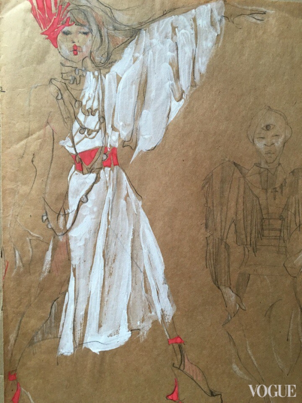 Жан Грицфельд: Мне бы хотелось совместить брючные элементы с каким-то палантином с вышивкой, характерной для песни "1944" на полупрозрачной основе. Можно обыграть этот образ и сделать трансформацию, например, своего рода рождение солнца после длинной ночи, как надежды, которая тебя согревает, а Джа выступает как символ в данном контексте.