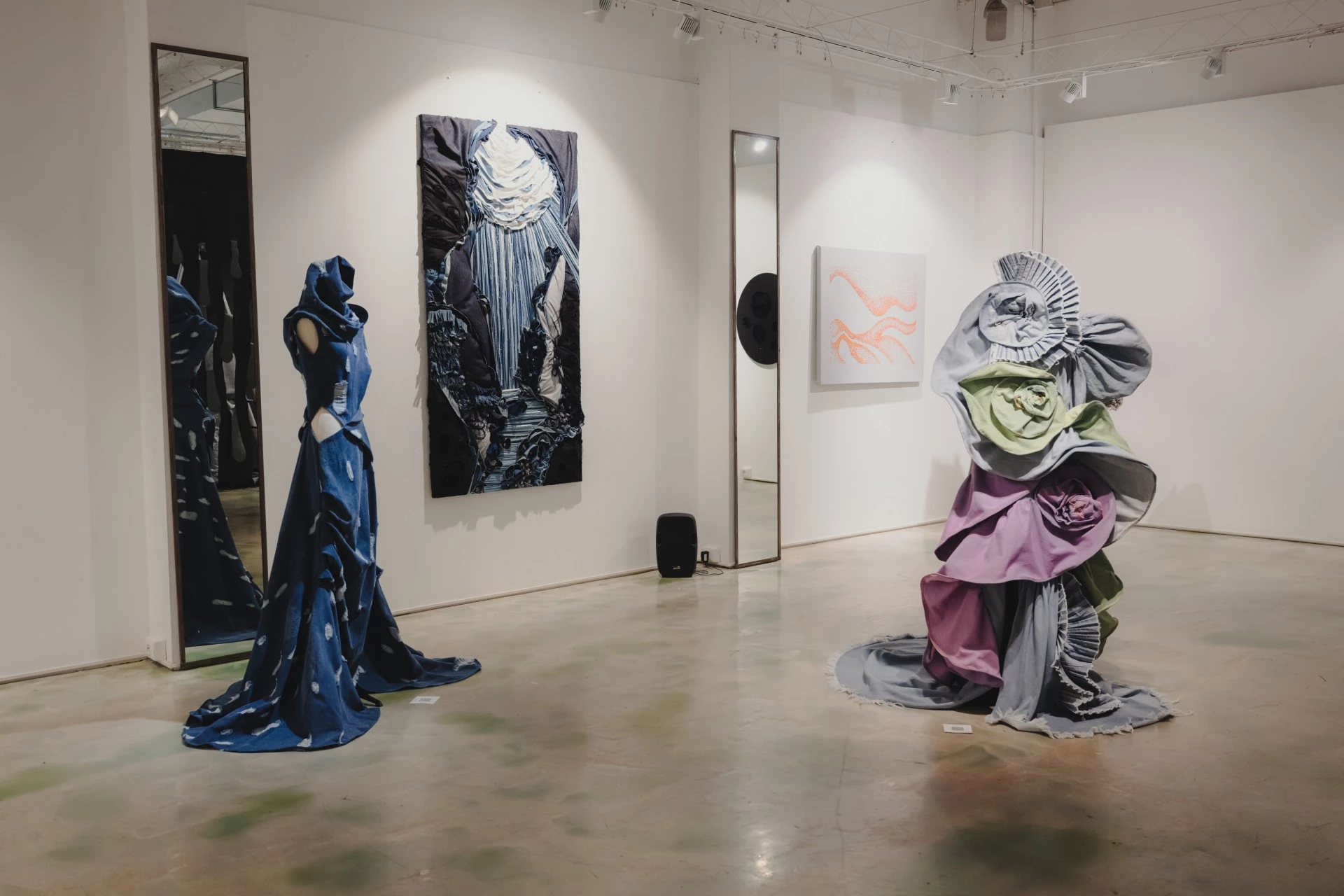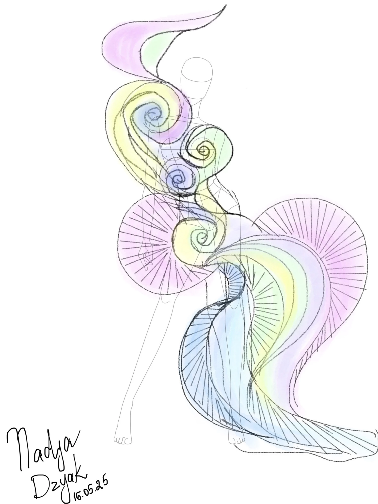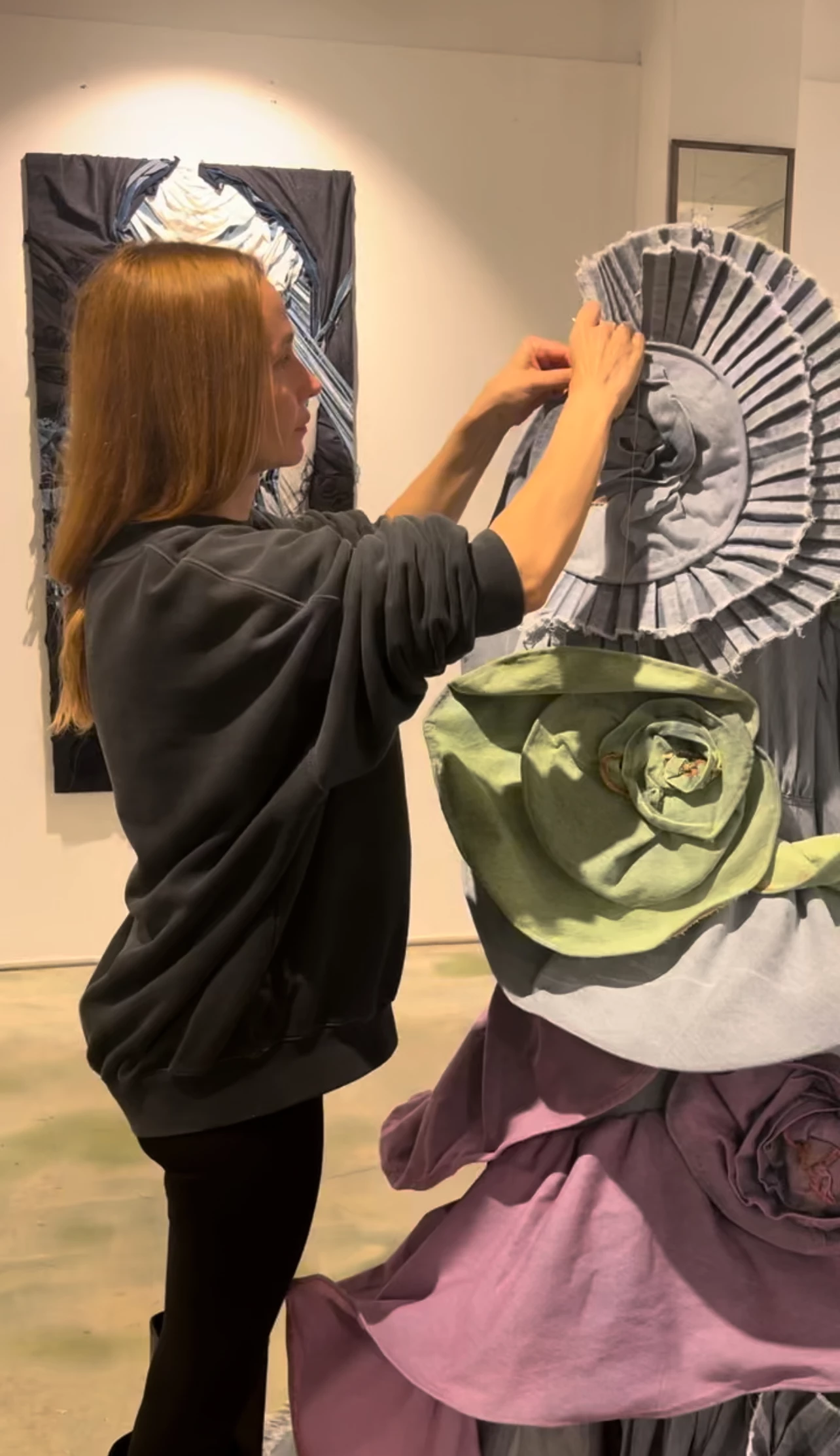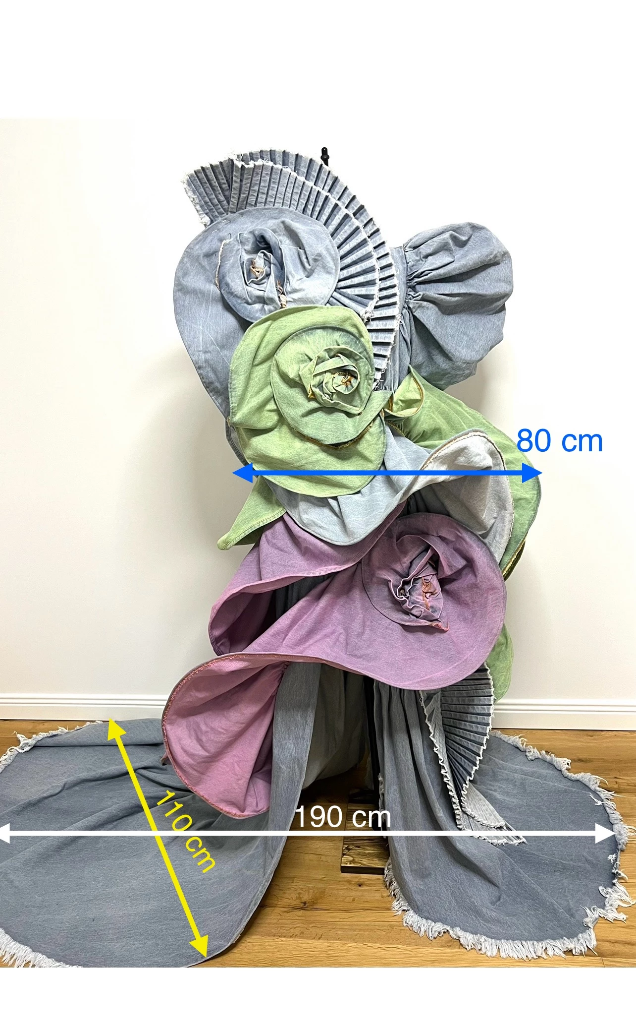 Після обробки денім радикально змінився: з темного й щільного він став світлішим, м’якшим і менш формостійким. Саме тут знадобився підхід Надії до об’ємів і конструкції. Щоб відтворити задуману архітектоніку, команда використала низку спеціальних прийомів, зокрема дріт і виробничі методи формоутворення, завдяки яким волани набули скульптурної стійкості. Усі об’ємні елементи сукні закріплено вручну, адже машинний шов тут практично неможливий. Композиція вибудовувалася на манекені, довго коригувалася і лише після численних примірювань остаточно фіксувалася стібок за стібком.