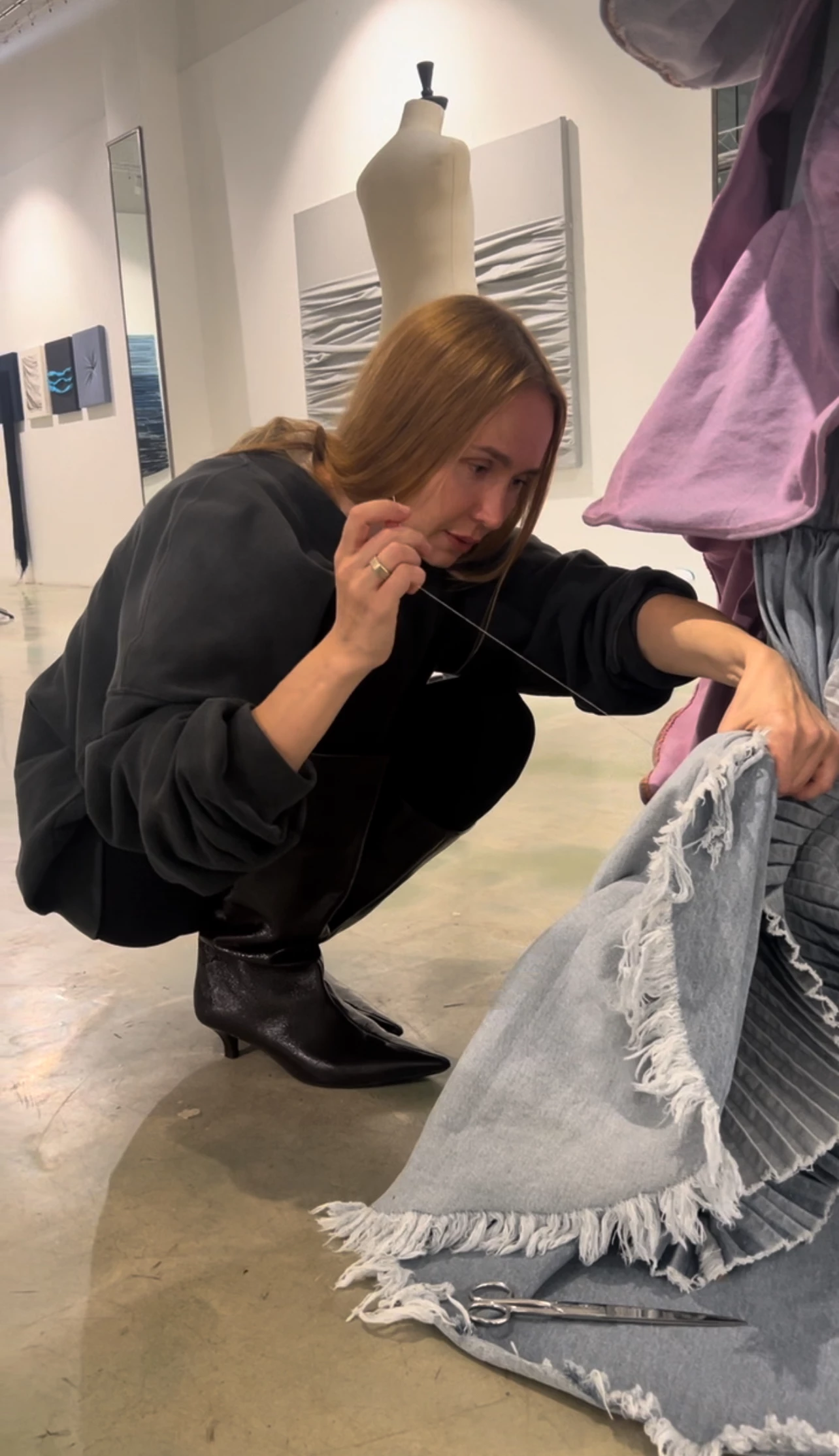У травні наша команда отримала лист від Kering. Бренд увійшов до десятки дизайнерів світу, запрошених до міжнародного денімпроєкту, покликаного показати, як сучасні екологічні технології змінюють один із найскладніших для довкілля сегментів модної індустрії. Завданням кожного учасника було створити не просто річ, а дизайнерський артоб’єкт, у якому виразно прочитується ДНК бренду. Прем’єра відбулася в Мілані у Fondazione Sozzani.