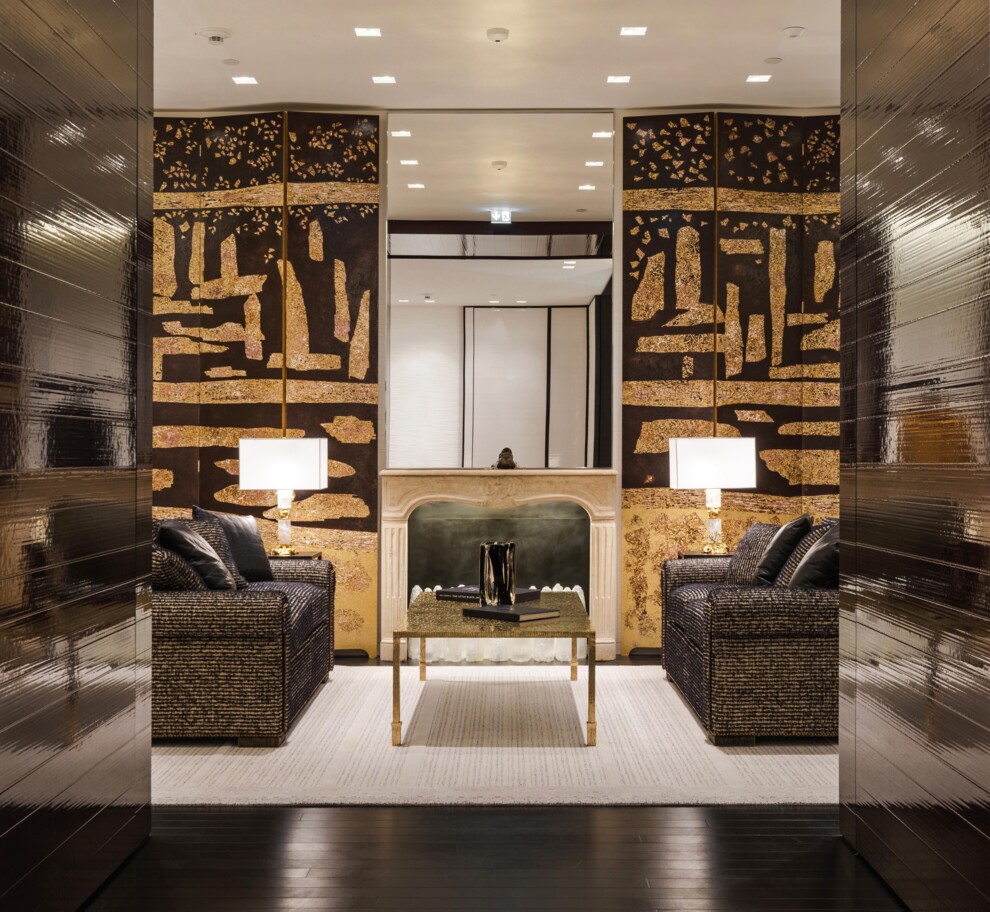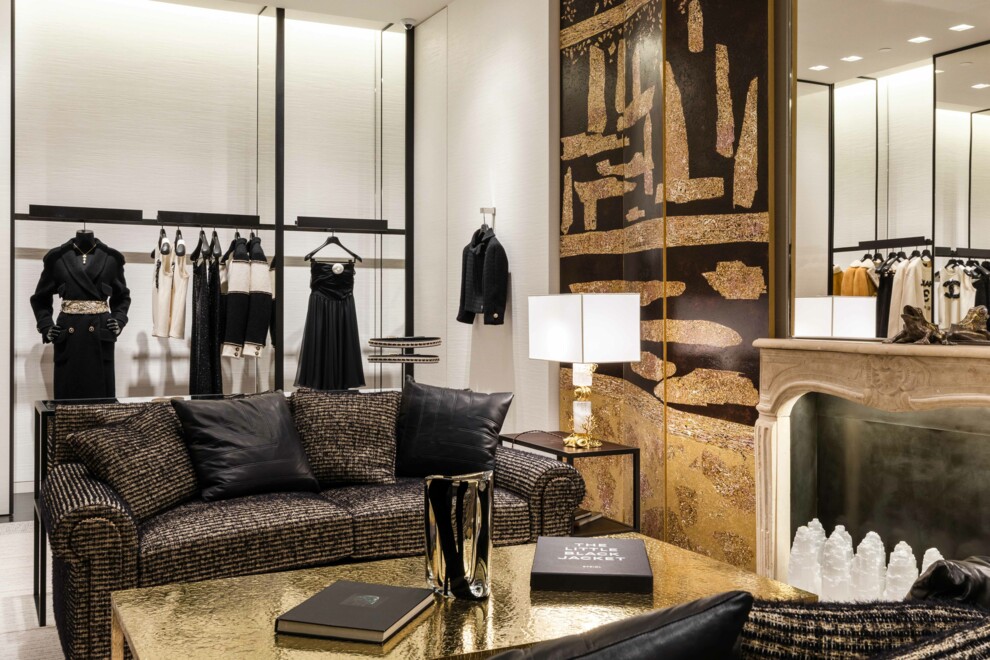 Бутик CHANEL у КиєвіЗа ним — взуттєвий салон, обставлений елегантними диванами, двері ліворуч ведуть до найбільшого салону RTW з трьома просторими примірювальними. Цей салон відкривається в другу, камернішу зону RTW, де є затишний камін, оточений розкішними золотими й чорними ширмами. Тут велика примірювальна забезпечує всамітнення.