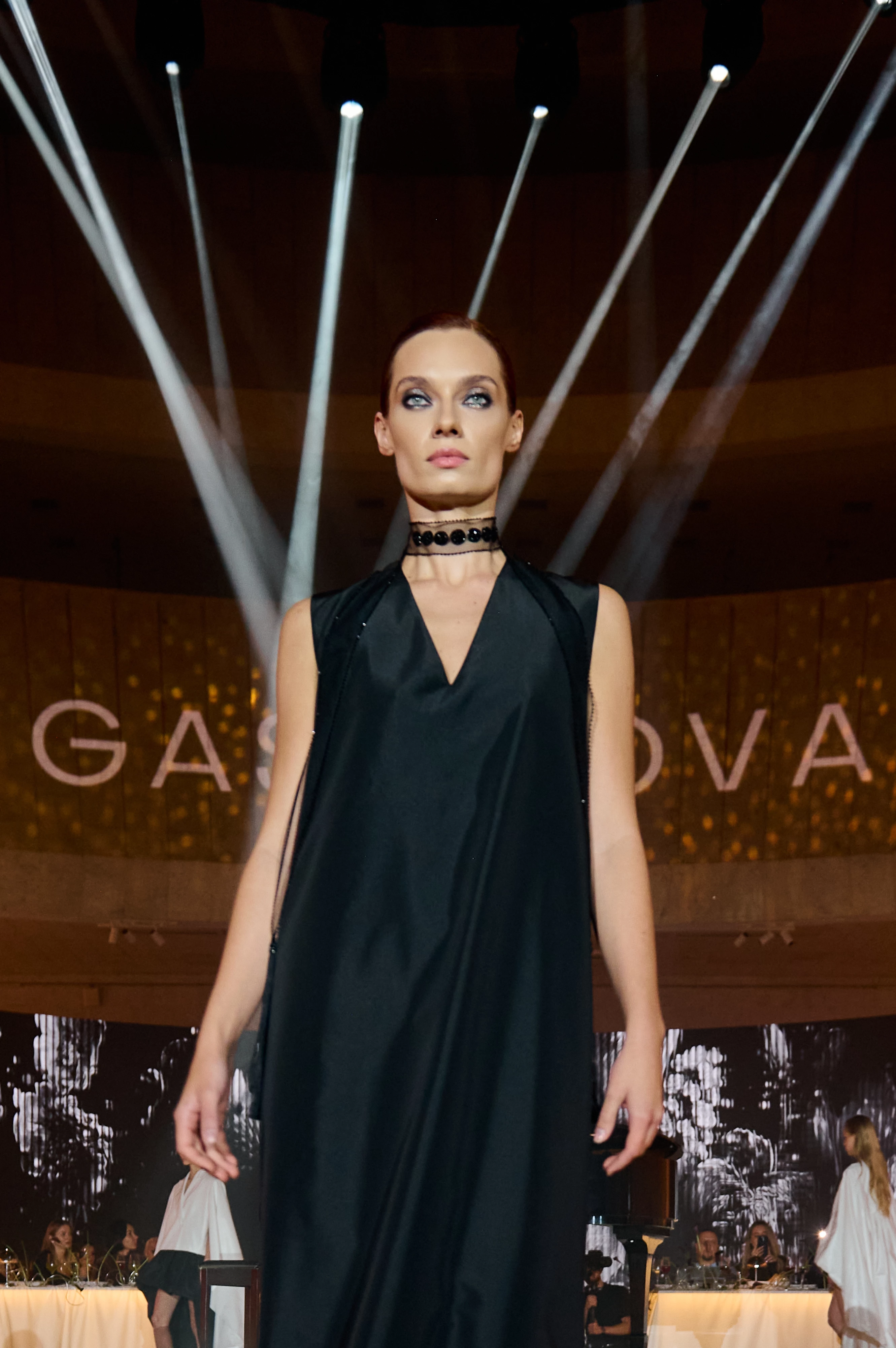 До колекції увійшло 30 суконь різноманітних силуетів — від моделей з акцентними плечима й довгими шлейфами до обʼємних суконь з рюшами та прозорих приталених форм, інкрустованих кристалами. Колірна палітра витримана в елегантних чорних і білих відтінках. "Кожна сукня — унікальний витвір ручної роботи, що народився з багатогодинної праці, внутрішньої тиші та глибокої зосередженості. Хотілося, щоб за формою залишалося відчуття душі — не просто показати моду, а розповісти про українську силу через мистецтво високої моди. Це вимагало колосальної концентрації й емоційної витривалості", — розповідає Ельвіра Гасанова, яка продемонструвала зовсім іншу грань бренду Gasanova, героїня якої помітно подорослішала, а замість звичного блиску відтепер обирає гру пропорцій та об'ємів. Проте незмінним остається головне — чуттєвість і глибина кожного образу.
