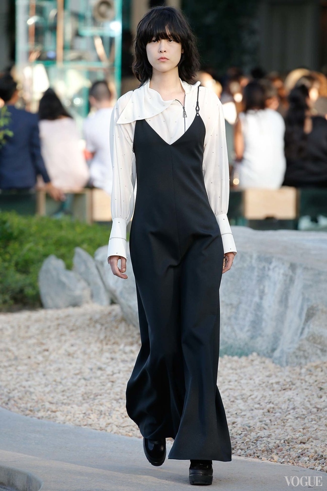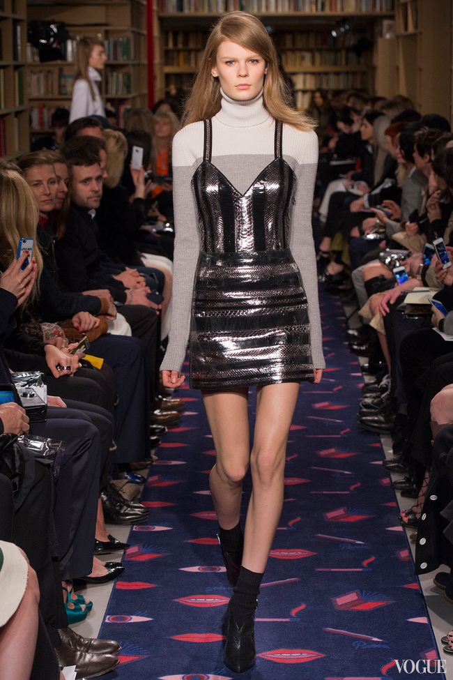 По-новому на этот предмет гардероба посмотрел Николя Жескьер из Louis Vuitton, который под тонкое платье на бретелях надел белоснежную блузу. На показе Sonia Rykiel был использован похожий прием, только вместо сорочки была надета водолазка под горло.