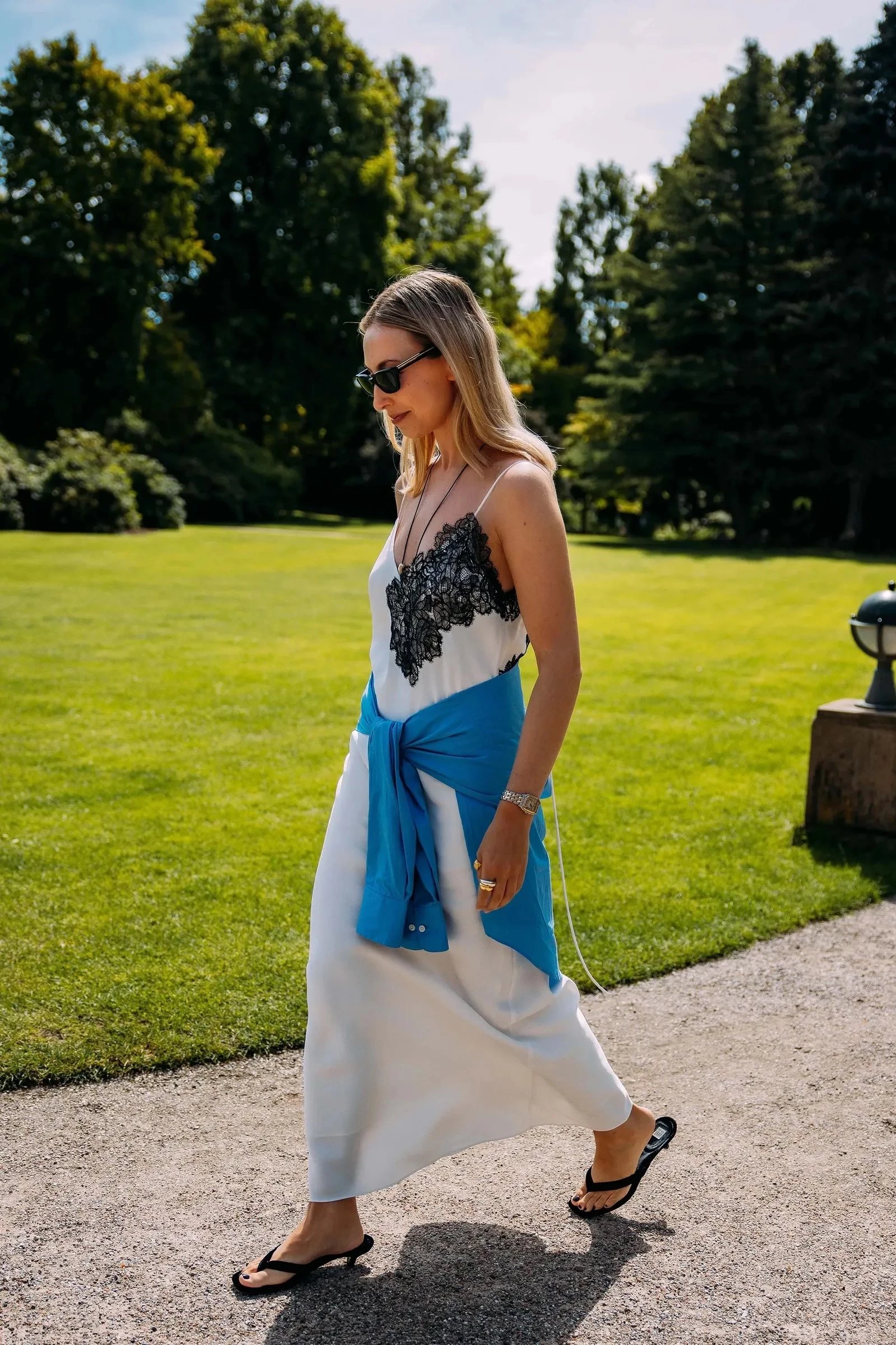 Редакторка Vogue Маделін Фасс вважає в’єтнамки на підборах своїм улюбленим взуттям на літо. І вона має рацію. Такі моделі, зокрема, з’явилися в колекції Khaite весна-літо 2025. Вони значно витонченіші за звичні пляжні варіанти, але залишаються такими ж легкими й невимушеними. Найкраще вони виглядають у парі з атласною або шовковою сукнею комбінацією. Це поєднання створює дуже жіночний і сучасний літній образ, який підійде як для повсякденного носіння, так і для вечора.