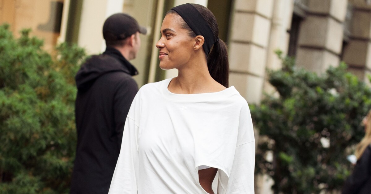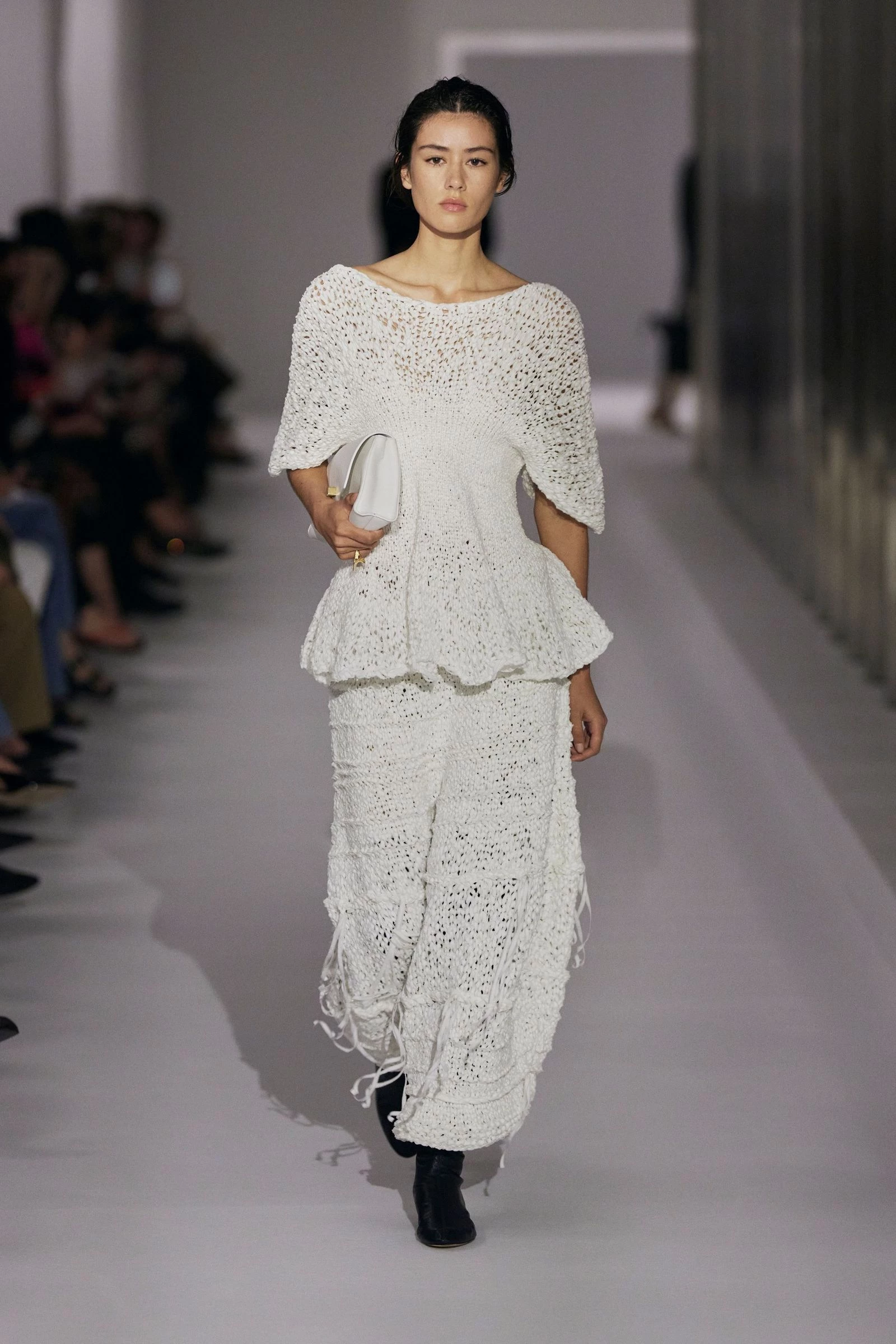 Бренд Khaite представив мінімалістичний образ у білому кольорі: довга спідниця кроше та блуза ідентичного відтінку. Завершенням стали чоботи-шкарпетки у стилі нормкор. В’язана фактура, об’ємний крій і взуття без зайвого декору створюють стриманий і витончений образ. Це один із найстильніших способів, як носити довгу спідницю з чоботами влітку — і не перевантажити образ.