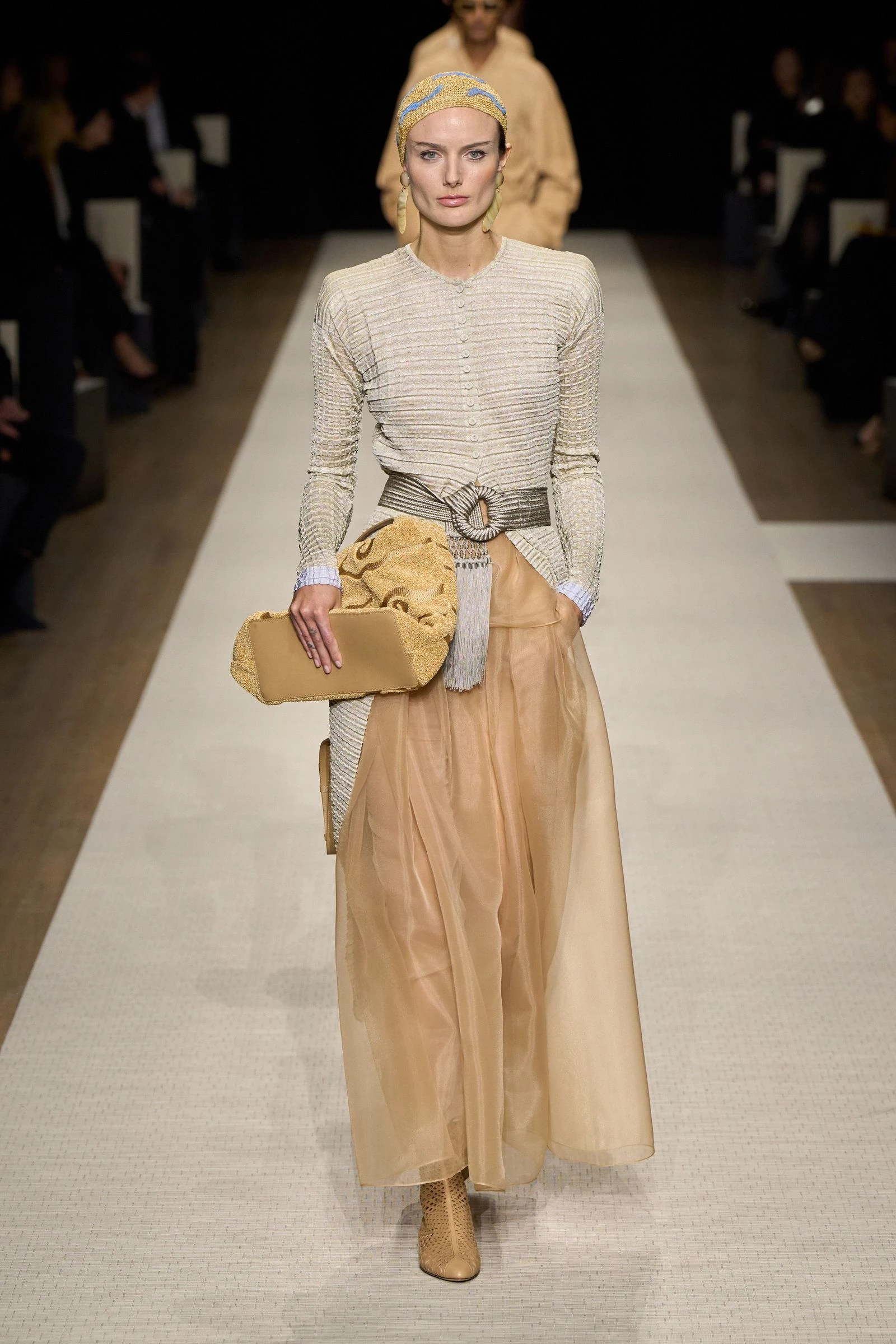 У колекції Giorgio Armani весна-літо 2025 показали ідеальний образ для спекотного клімату. Довга бежева спідниця з напівпрозорої тканини поєднується з чоботами в тон, прикрашеними перфорацією. До цього додали приталену блузку з маленькими ґудзиками та пояс з круглою пряжкою.
