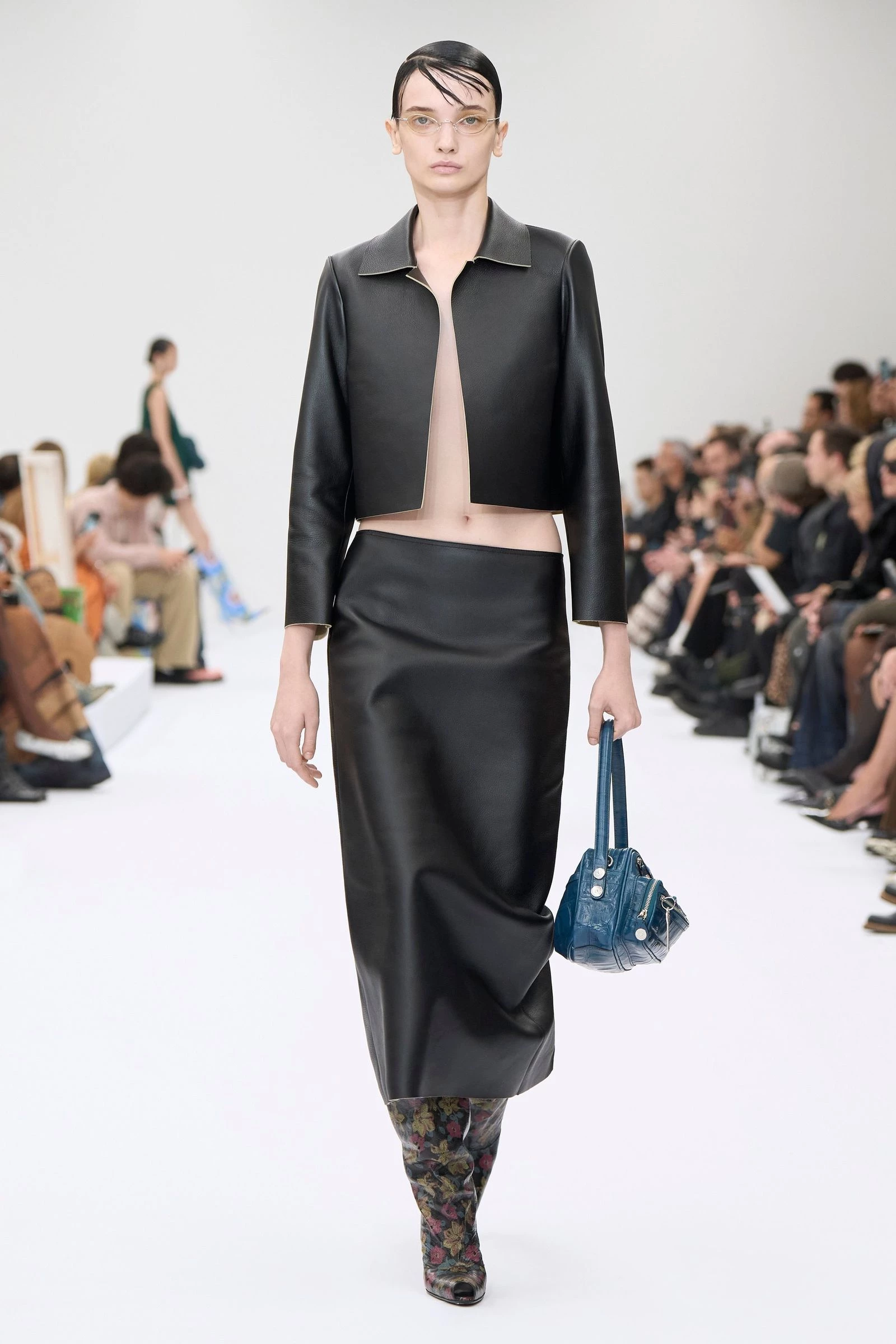 У колекції Acne Studios весна-літо 2025 показали образ, який поєднує романтику і бунт. Шкіряна спідниця з у глибокому шоколадному відтінку має низьку посадку, а куртка в тон додає образу строгості. На контрасті — квіткові ботильйони з відкритим носком та зжатим верхом. Це нова версія стилю bikercore, м’якша і більш романтична.