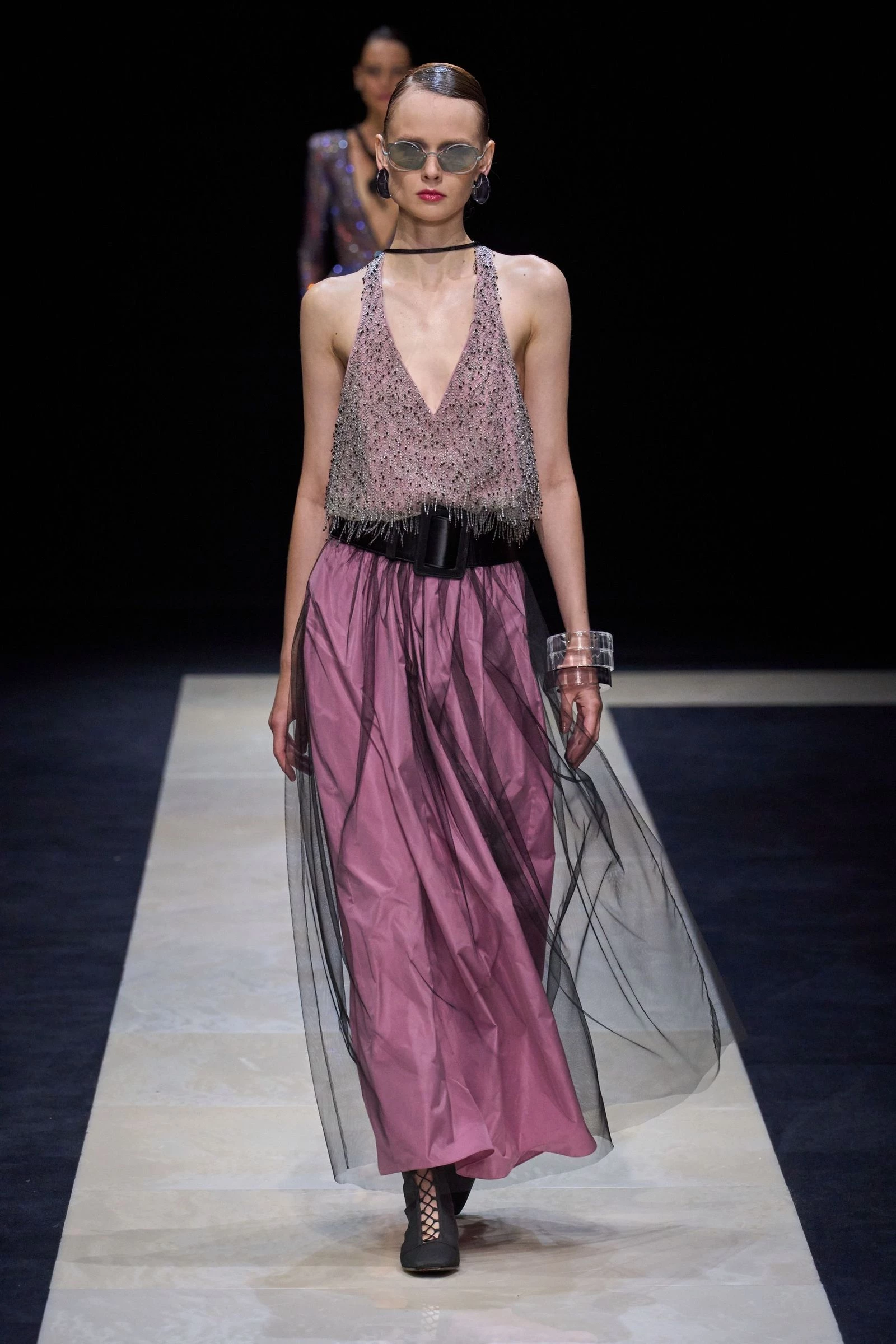 У колекції Emporio Armani весна-літо 2025 представили образ, який стане ідеальним варіантом для весільних гостей або вечірнього заходу. Довга рожева спідниця з високою талією і шаром чорного тюлю створює ефект багатошаровості. Її поєднали з текстурованою блузкою з V-подібним вирізом, широким поясом і шнурованими вікторіанськими чоботами. Це приклад того, як замінити класичну сукню на щось більш сучасне й виразне.
