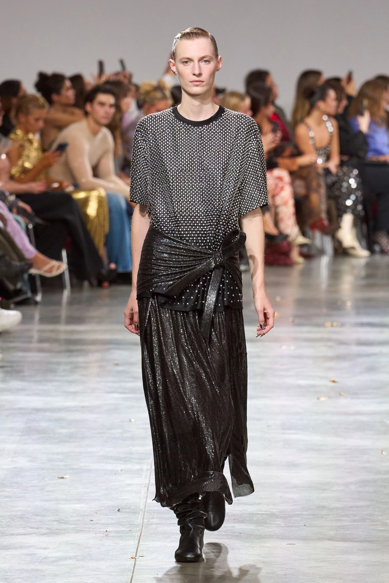 У колекції Rabanne весна-літо 2025 можна побачити ще один приклад літньої спідниці, яку варто носити з чоботами. Пряма блискуча модель довжиною до щиколоток прикрашена драпіруванням на стегнах і великим бантом. Її поєднали з великою футболкою зі срібними заклепками та високими зморшкуватими чоботами. Образ має ефектний вигляд, але при цьому дуже сучасний. Такий образ легко уявити як на модному заході, так і на вечірці в місті.
