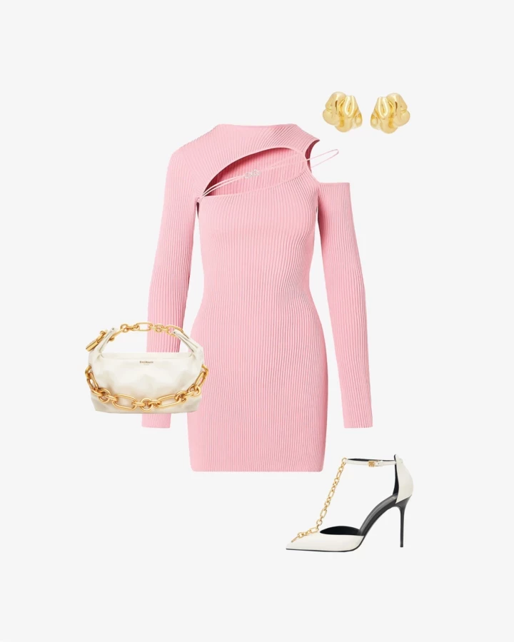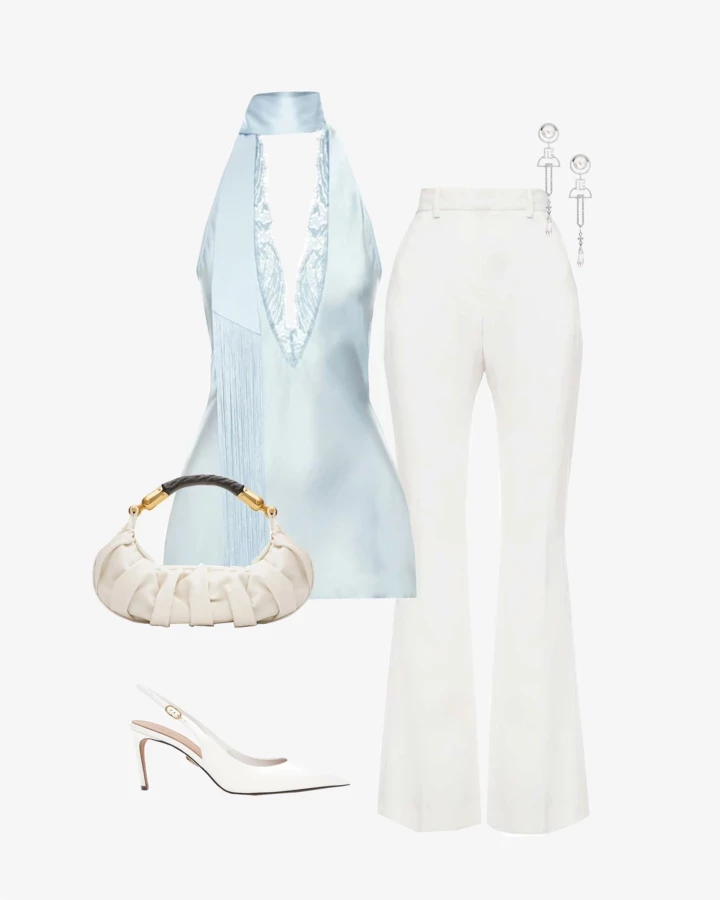 Крижано-блактиний – один із найпопулярніших відтінків 2026 року, а його ідеальним обрамленням стане Cloud Dancer, головний колір за версією Pantone. Оберіть атласний топ з мереживними вставками та поєднайте його з білими штанами кльош, мінісумкою та довгими сережками. Трикотажна мінісукня також стане чудовим святковим варіантом: віддайте перевагу ніжно-рожевій моделі з розрізами, а аксесуари з золотими ланцюжками перетворять образ на справжній витвір мистецтва.