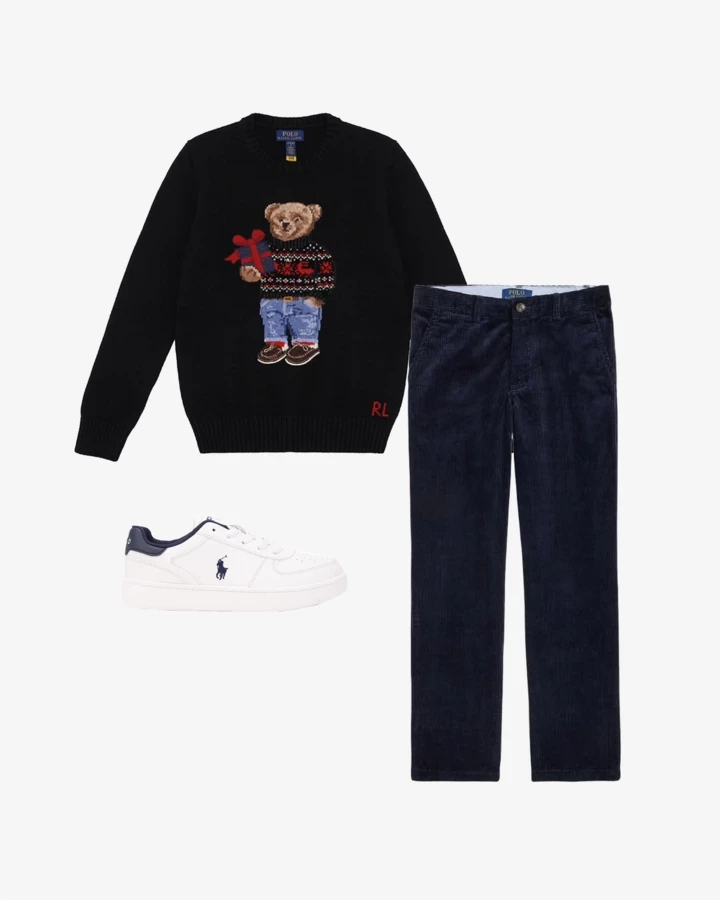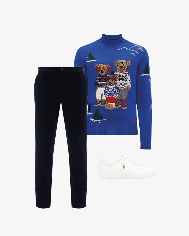 Для подій зі строгим дрескодом ідеальним вибором стане оксамитовий костюм – безпрограшний варіант святкового сезону. Поєднуйте його з білою сорочкою та тонким шовковим пуловером для вишуканого, але не перевантаженого образу. Якщо ж формат події дозволяє більше свободи, зверніть увагу на затишний трикотаж. Синій светр із культовими ведмедями Polo Ralph Lauren у тандемі з улюбленими джинсами та білими кросівками створює позачасову формулу розслабленого зимового стилю.