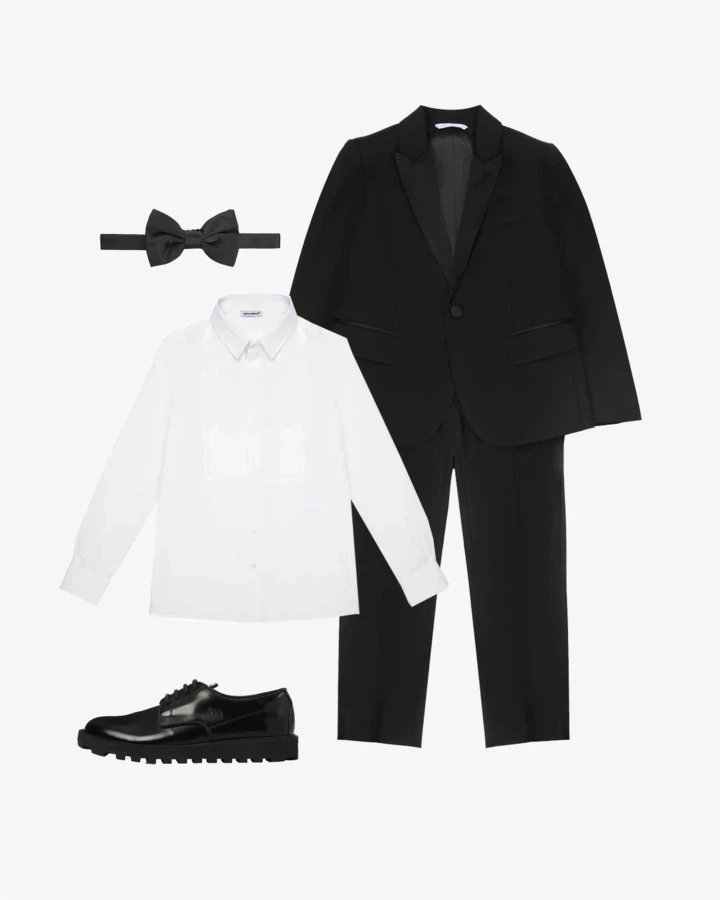 Юним джентльменам точно сподобається ошатний комплект у дусі black tie: чорний костюм з атласними лацканами, біла сорочка, лаковані туфлі та краватка-метелик – і стильний образ маленького денді готовий. А для менш формальних подій варто обрати розслаблений сет із вовняного светра, джинсів і білих кросівок – ідеальний варіант для затишного святкування та милих family look.