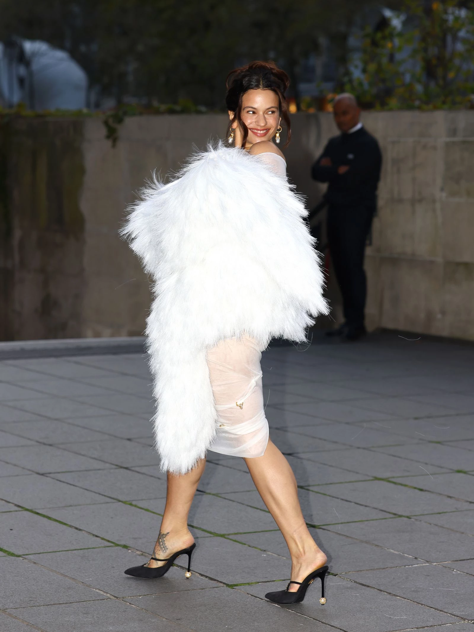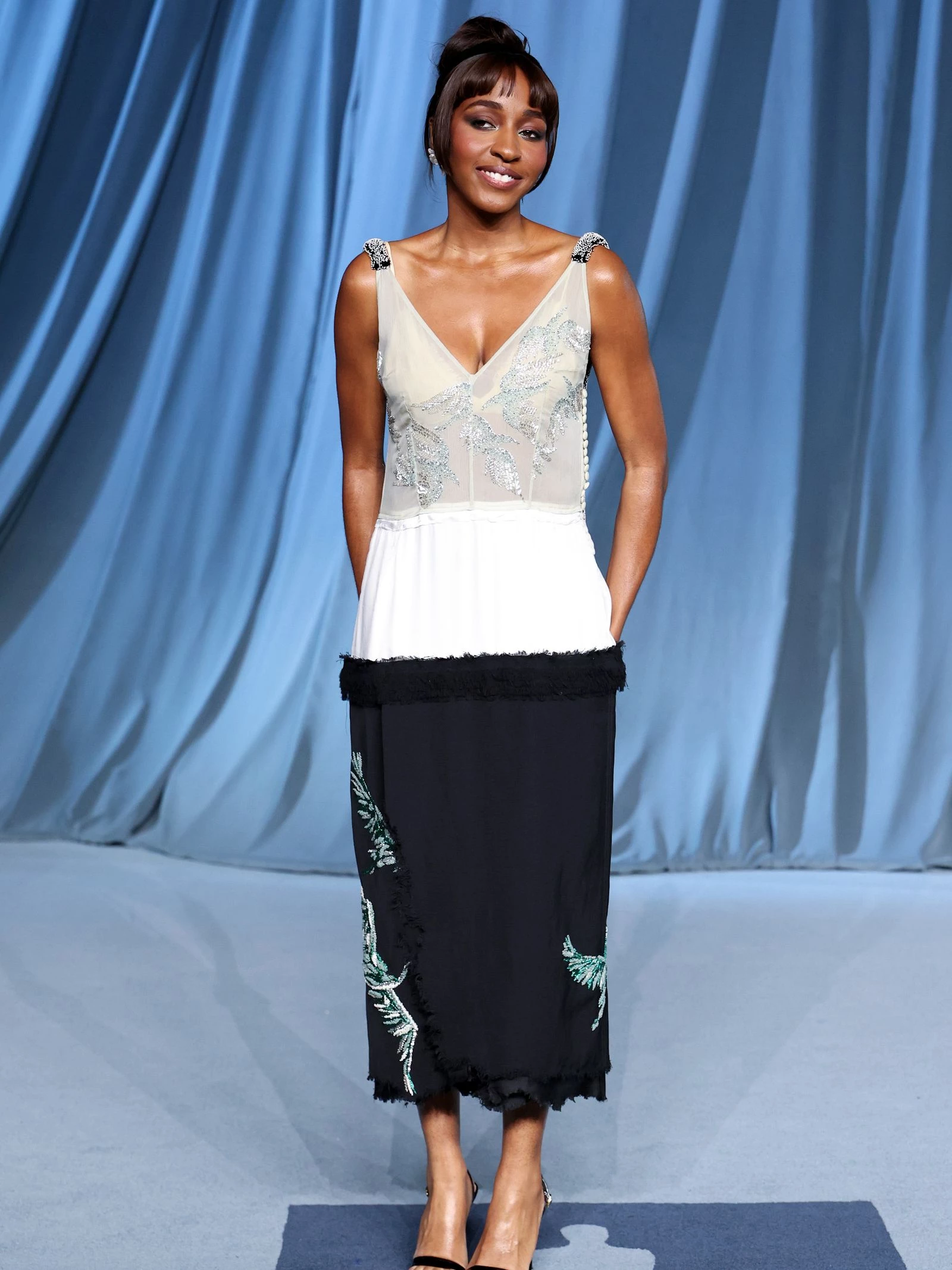 Найкращий образ 2025 року: Ангельська біла сукня-сліп Palomo Spain із чорною накидкою з органзи, що, здавалося, порушує закони гравітації.