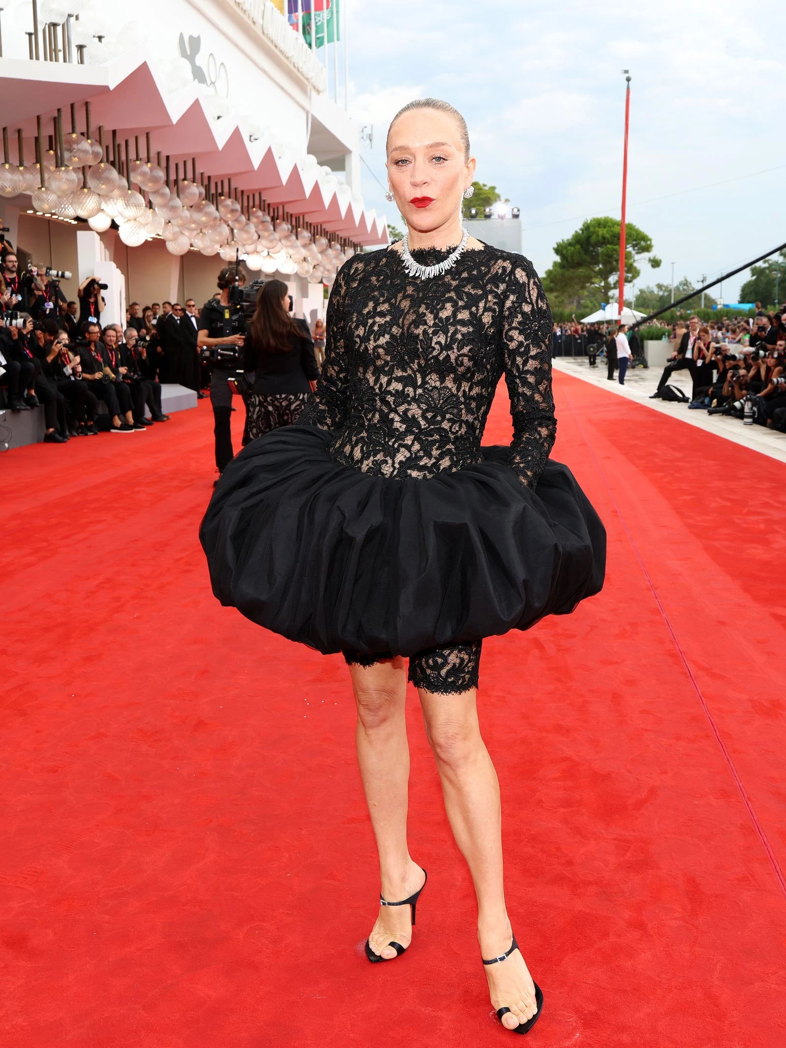 Найкращий образ 2025 року: На Венеційському кінофестивалі вона вразила червону доріжку чорним мереживним комбінезоном Saint Laurent із об’ємною спідницею bubble та діамантовими прикрасами Tiffany & Co.
