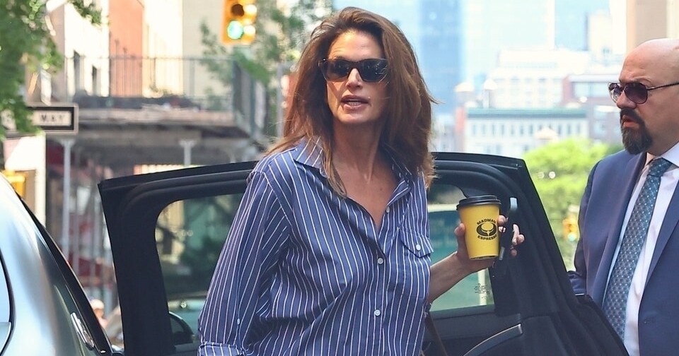 Щоб заїхати за кавою до Madman Espresso у Нью-Йорку, супермодель Сінді Кроуфорд вдягнула стриманий образ, для якого вибрала синю сорочку у тонку білу смужку та прямі джинси з необробленим краєм. Саме сорочка стала ключовим елементом стилізації, адже Кроуфорд залишила її розщебнутою рівно настільки, аби показати своє декольте, та злегка заправила сорочку у джинси.