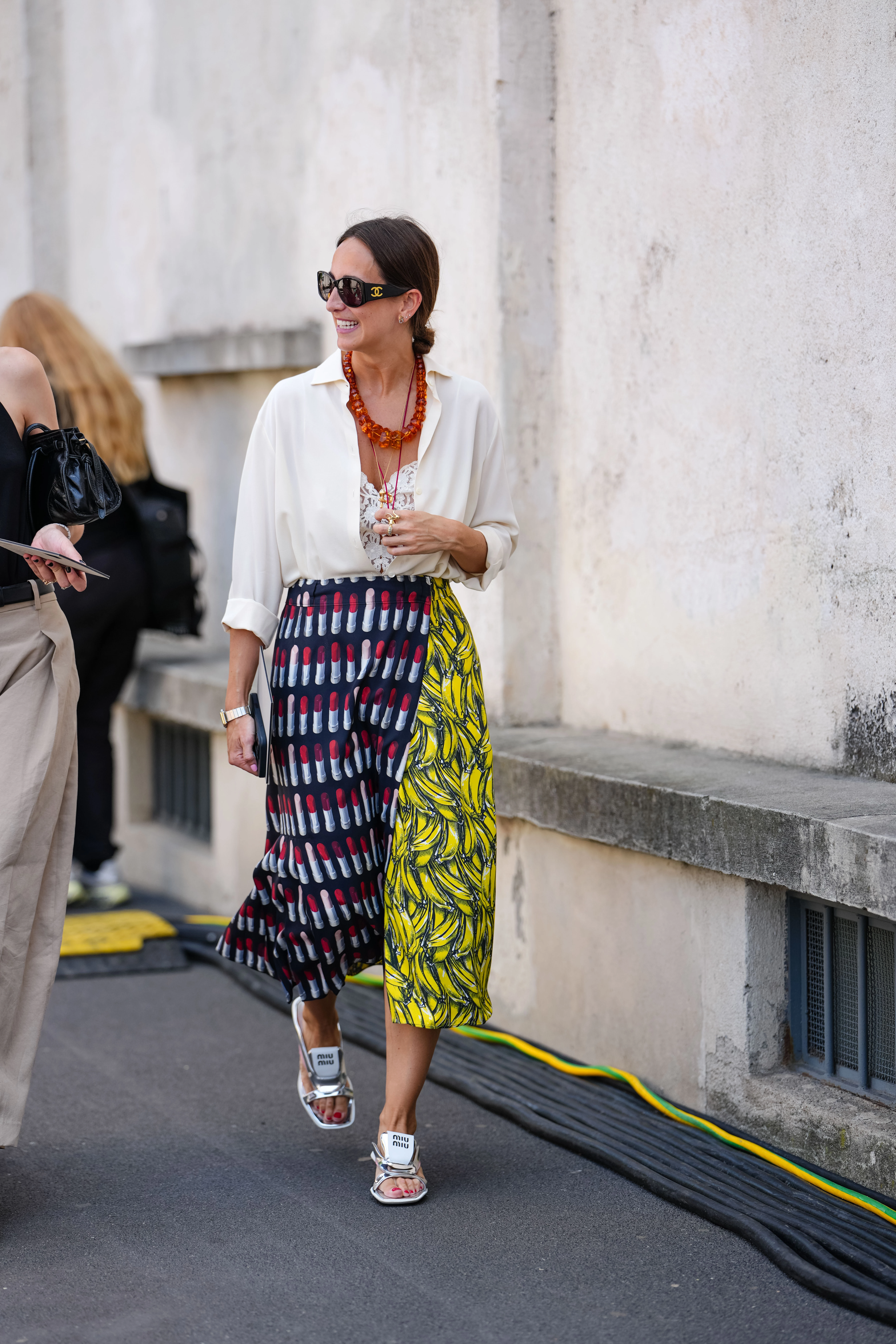 Спідниця з колекції Dries Van Noten весна-літо 2025 — ідеальне рішення для тих, хто шукає ефектний літній образ. Її принт настільки насичений, що решта елементів можуть бути простими. Наприклад, біла майка-боксерка від Veronica Beard та підвіска у вигляді мушлі від Jennifer Behr. В'єтнамки з тисненням під крокодила від Toteme завершують образ.