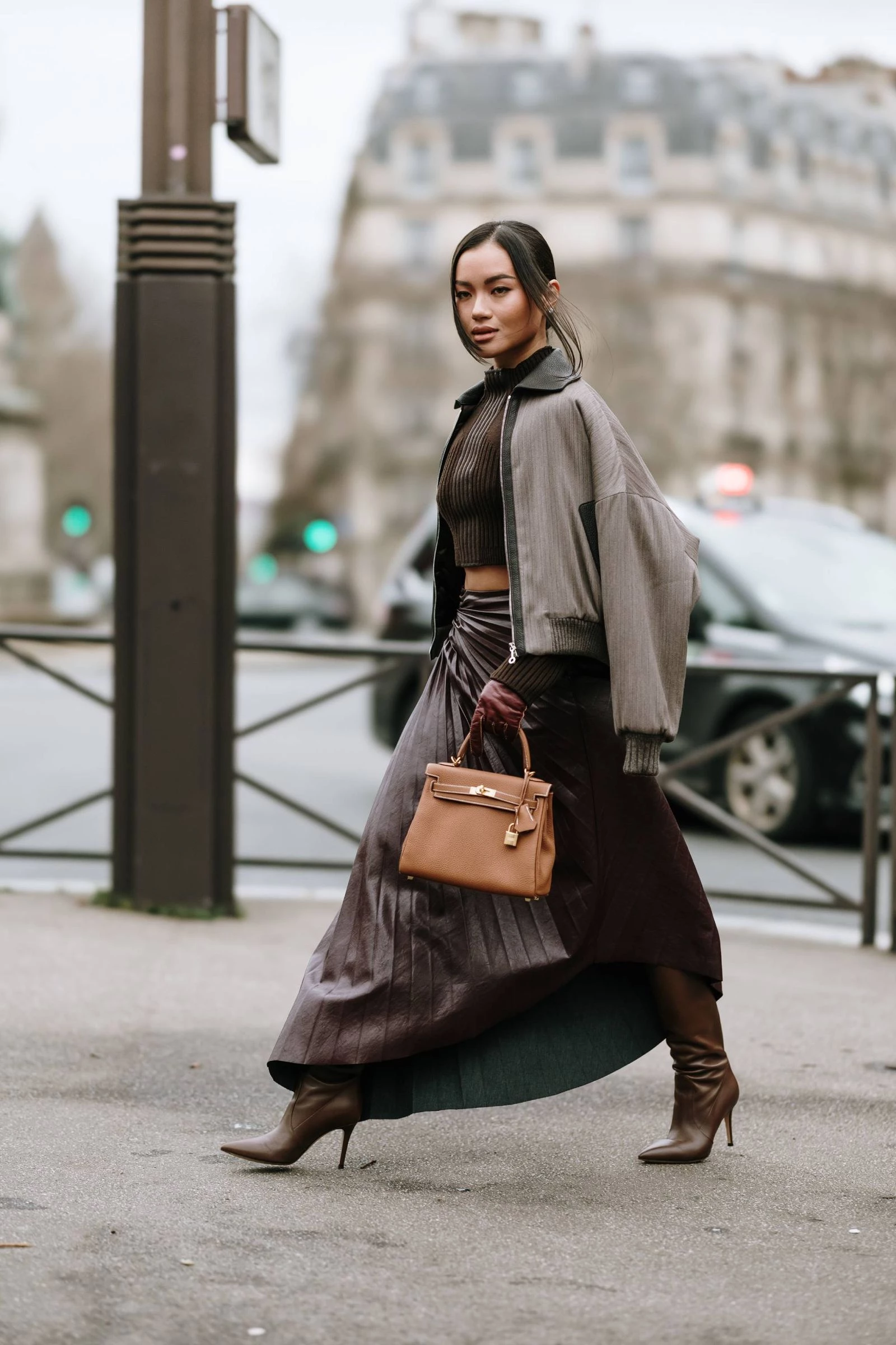 Плісировані спідниці залишаються модною класикою. Укорочені моделі асоціюються з естетикою преппі та тенісу, але влітку 2025 року дизайнери Chloé та Dior зробили ставку на довгі плісировані варіанти. Поєднайте їх з високими чоботами кольору кави та об'ємним жакетом — такий комплект виглядає сучасно, впевнено й водночас універсально.