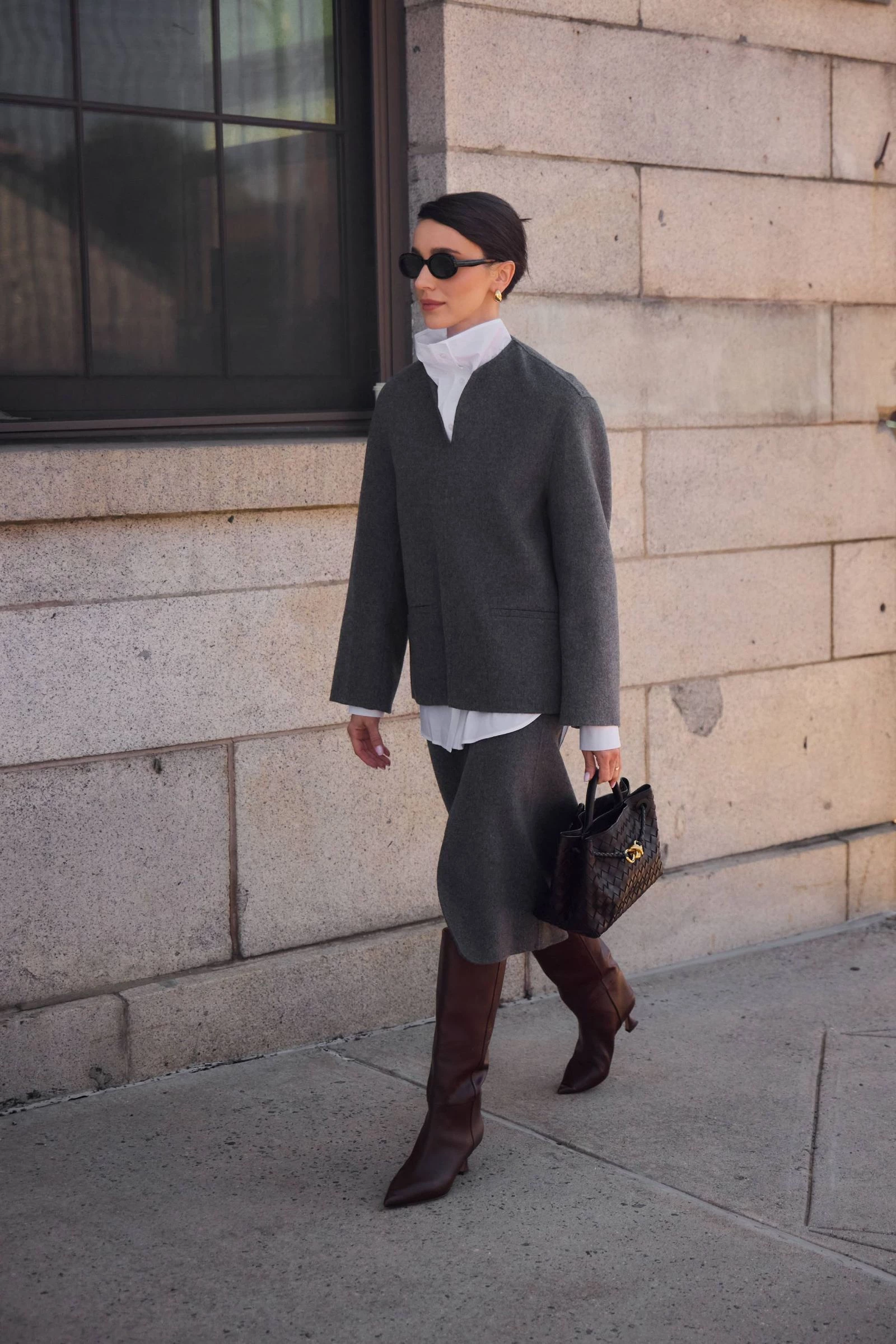 Для швидкого, але стильного образу оберіть костюм-двійку зі спідниці міді та светра у тон. Додайте високі чоботи до коліна глибокого коричневого кольору та блузу з високим коміром у стилі The Row. Це універсальний варіант, який підходить і для офісу, і для вечірніх виходів.