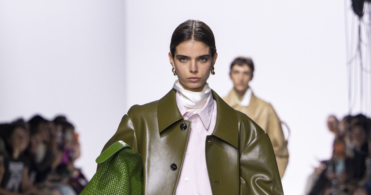 Сорочка залишається однією з базових речей гардероба і в сезоні весна-літо 2026. У рожевому кольорі вона виглядає свіжо й сучасно. У колекції Bottega Veneta рожеву сорочку поєднали з сірою шкіряною спідницею, сатиновим топом, зеленим пальтом і сумкою насичено-зеленого відтінку.