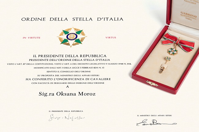 В свое время Орден Звезды Италии получили Фрэнк Синатра, Джон Кеннеди, княгиня Шарлен Монакская. Эту почетную награду вручают иностранным гражданам за значительный вклад в развитие культурных, политических и внешнеэкономических отношений с Италией на международном уровне. Оксана Мороз-Хант первый и, на сегодняшний день, единственный представитель украинского fashion-рынка, получивший это почетное звание.