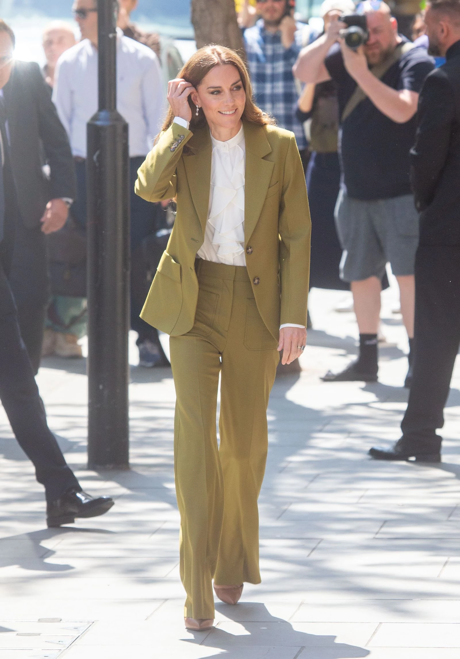 Для цього виходу Кейт Міддлтон обрала сірий костюм Bella Freud із класичним картатим принтом "принце Уельський" — жест у бік титулу її чоловіка. У цьому ж костюмі вона вже з’являлася під час візиту до Marina Mill у Кенті. Під жакет принцеса вдягнула тонкий сірий светр Alexander McQueen, доповнивши його темно-синім ременем і замшевими туфлями Gianvito Rossi. Образ завершили годинник Ballon Bleu de Cartier, сережки з діамантами та сапфірами — подарунок від принца Вільяма, а також брошка з крилами Royal Air Force, прикріплена до лацкана. Її волосся, яке стало трохи світлішим, було вкладене у фірмову зачіску з м’якими хвилями.