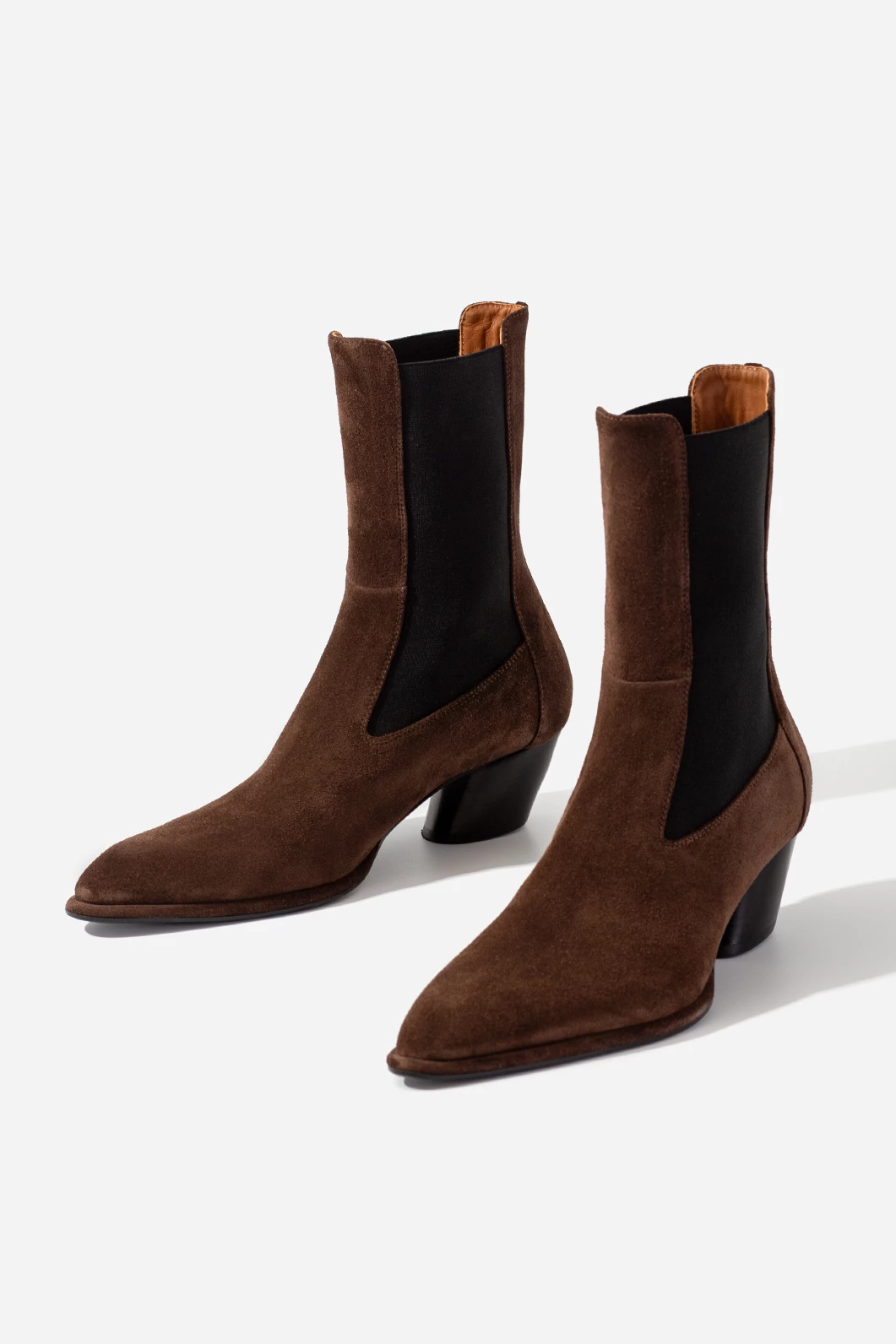 Шоколадний коричневий залишається серед головних кольорів цього сезону осінь-зима 2025/2026. Як і класика осіннього взуття — челсі. Якщо ви прагнете креативнішого погляду на них, придивіться до подібної пари з елементами ковбойок. Щодо стилізацій, можна наслідувати приклад моделей, взуваючи їх під довгі джинси.